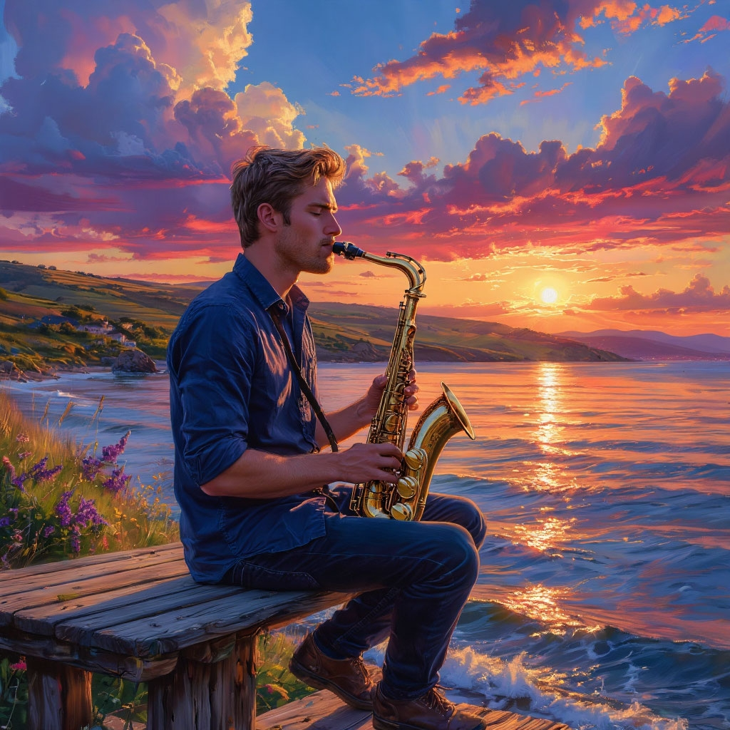 Saxophone, acoustic guitar, and a symphony orchestra, The saxophone plays soulful music that evokes a warm evening by the sea, You can hear the sound of the waves and the distant cries of seagulls