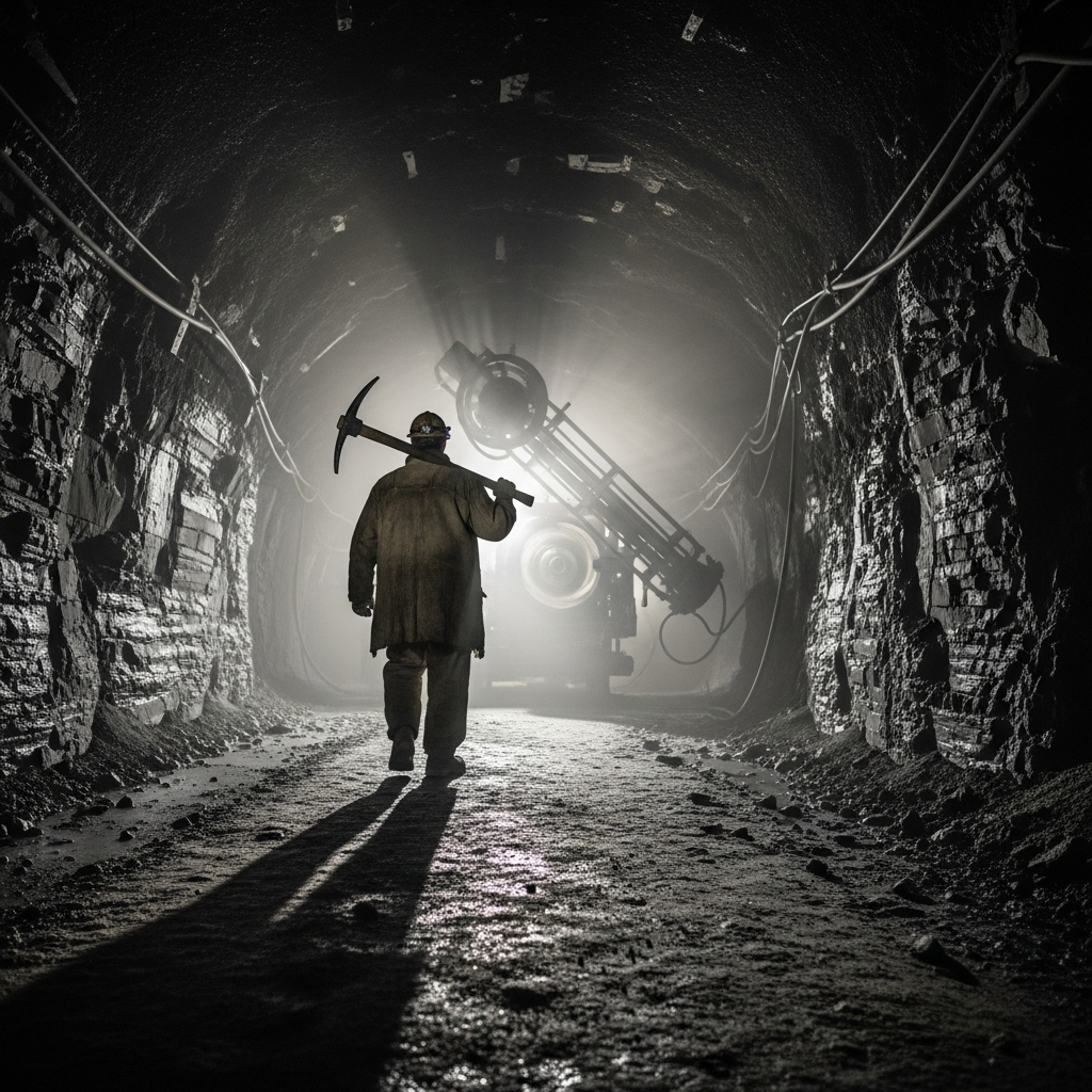 A dark, heavy, and rhythmically intense industrial minimalism track with a relentless, mechanical tempo, The primary instrumentation is a low-cycle sub-bass drone that feels like hydrostatic pressure, a deep, full, resonant texture, overlaid with highly syncopated and complex metallic percussion (sounding like stoper drills and grinding metal on metal) that rarely lets up, The mood is resigned, cold, and deterministically aggressive, The vocal delivery is a precise, deadpanned sprechgesang, sitting atop the mix, dry and brittle, contrasting sharply with the wet, overwhelming low-frequency rumble, Add textural details: the sound of a tightening j-bar, a sizzling electric arc, and faint strata-rattle sampled as rhythmic hi-hats, The composition is built on rhythmic density and sonic abrasion, not melody, [Fuse vocals: earthen, sinewy, dense, corroded, guttural, monotone, sprechgesang, glottal fry, pebble-throated, clenched], ‑humming intro, ‑hum, ‑vocalise, ‑humming, ‑intro