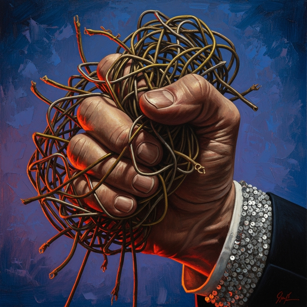 Genre: Industrial Post-Folk, Style: Tense, claustrophobic, analog, textural, dry, Instrumentation: Heavily compressed acoustic guitar (used rhythmically), detuned synthetic pulse bass (dominant low end), abrasive, dry drum kit with industrial percussion (rim shots, sampled sheet metal), distant, minor-key synth pads, Tense rhythmic syncopation at 124 BPM in D Phrygian mode, Dynamic arc builds from intimate spoken word to saturated, belting climax, [Tallow vocals: arid, leathery, resonant, dark, smoky, chalky, brittle, glottal fry, world-weary, taut, confidential, deadpanned, subdued, reciting, insistent, syncopated, whispering, gravelly, fibrillating], Avoid melodic major key resolution, ‑humming intro, ‑hum, ‑vocalise, ‑humming, ‑intro
