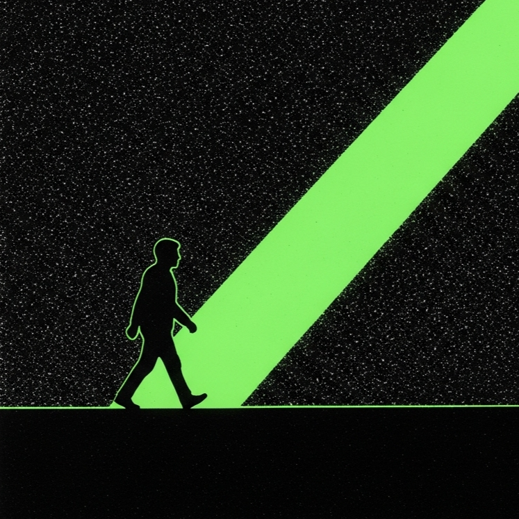 Tense Post-Punk Revival with a driving Krautrock motorik beat (140 bpm) in A minor, The sound is dry, paranoid, and spacious, reminiscent of early 2000s indie rock, A relentless, hypnotic bassline and tight, mechanical drums form the core groove, Guitars are angular, jagged, minimalist, using single-note stabs and sharp, repeating figures, The production is cold and clear-eyed, Bridge section features a dramatic textural drop to a single, ambient synth pad, [Corin vocals: baritone, cracked, frayed, glottal fry, smoke-damaged, shaky, delivered as a deadpanned, weary sprechgesang that evolves into a more intimate, resigned singing style], The outro introduces a simple, naive synth arpeggio after a moment of pure silence, ‑humming intro, ‑hum, ‑vocalise, ‑humming, ‑intro