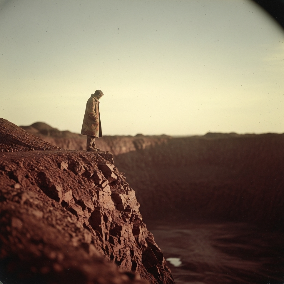 Industrial Folk-Rock, A mid-tempo (85 bpm) hypnotic groove built on a simple, saturated bassline and a gritty, mechanical lo-fi drum loop, The sonic space is cavernous, defined by the stark contrast between a raw, dry, upfront vocal and a clean, shimmering electric guitar playing sparse, angular melodies with heavy tape delay, Layers of foley (percussive metal scraping, crumbling plaster, geiger counter clicks) and distorted, swelling synth pads surge in the choruses, creating a dynamic shift from obsessive focus to overwhelming discovery, The production is tactile and decayed, with audible tape hiss, [Pilgrim vocals: dry, leathery, resonant, earthen, gritty, matte, weary, conversational, deadpanned, declarative, resigned, intimate, restrained, hushed, world-weary, insistent, hypnotic, breathy, cracked, threadbare, vocal fry, slightly behind-the-beat phrasing, parched, smoke-damaged], ‑humming intro, ‑hum, ‑vocalise, ‑humming, ‑intro