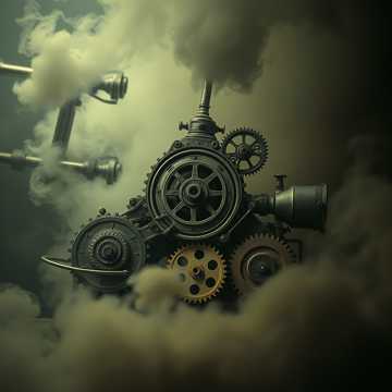 Style Prompt – Detailed: Dark industrial rock, 145 BPM, mechanical percussion, distorted bass guitar, grinding synth noise, glitch textures, metallic impacts, degraded tape loops, heavy compression, analog reverb, dynamic loud/quiet shifts, half-time grooves with syncopated drum fills, male shouts and whispers, layered cult chorus, Latin and Mythos chant vocals