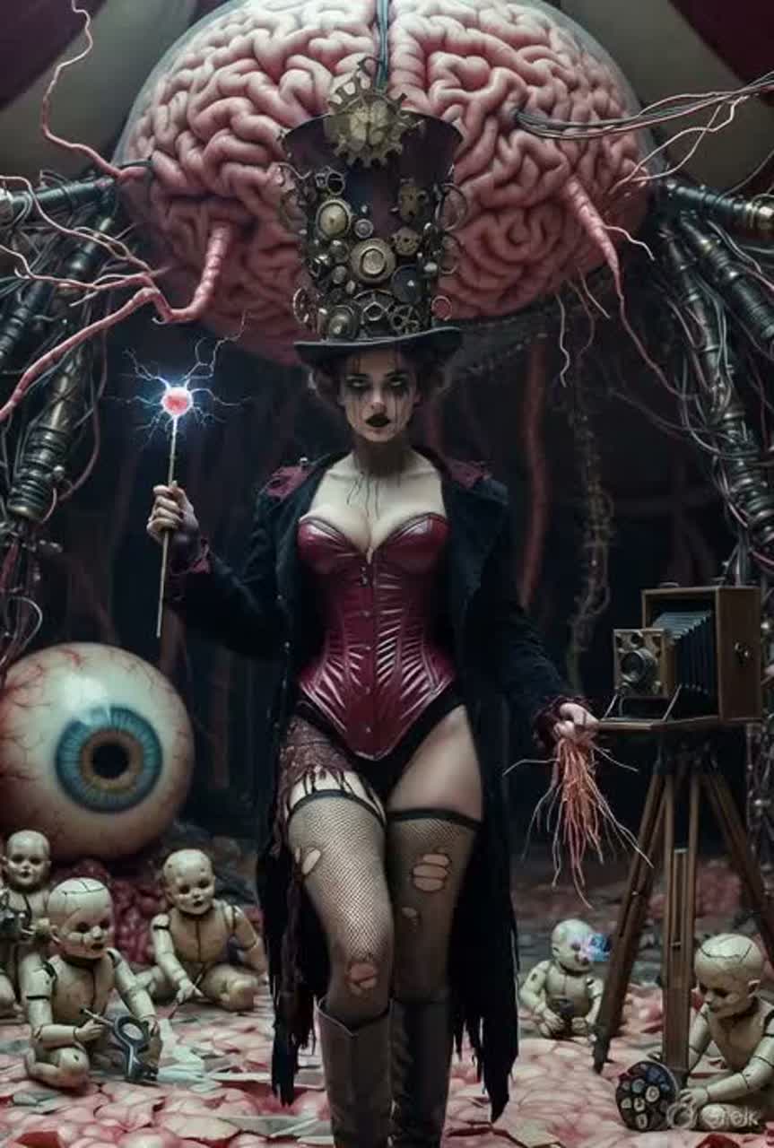 Opens with menacing circus organ and accordion, layered over pounding industrial drums, Heavy chugging guitars enter, delivering syncopated avant-garde riffs, Theatrical female vocals shift between operatic highs and guttural growls, Bridge features grotesque carnival motifs with cinematic build, ‑Horrorcore, ‑Downtempo, ‑Dark Shamanic