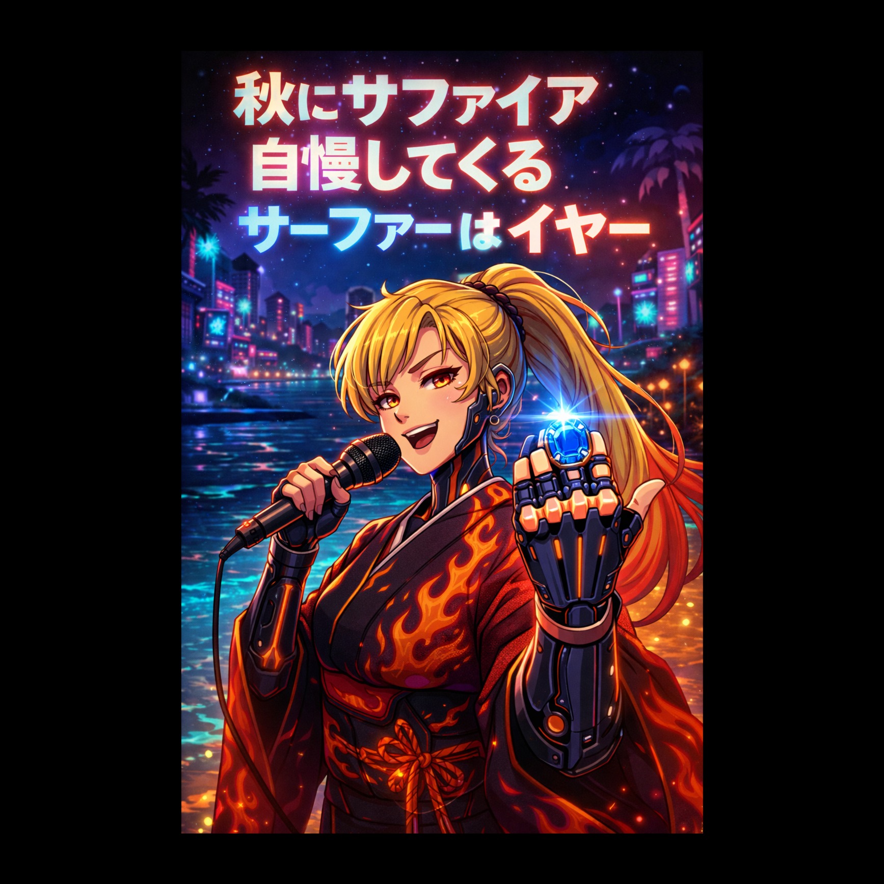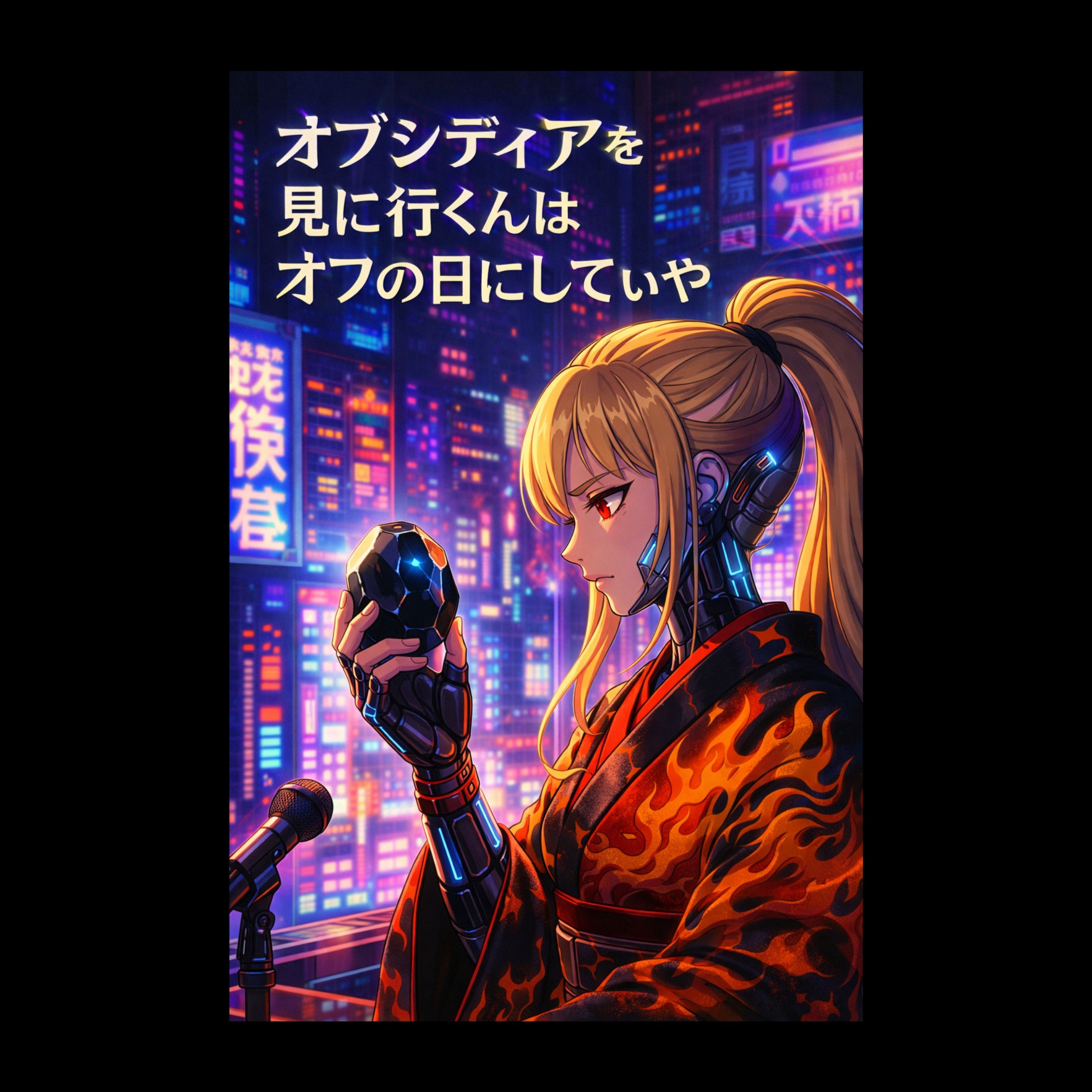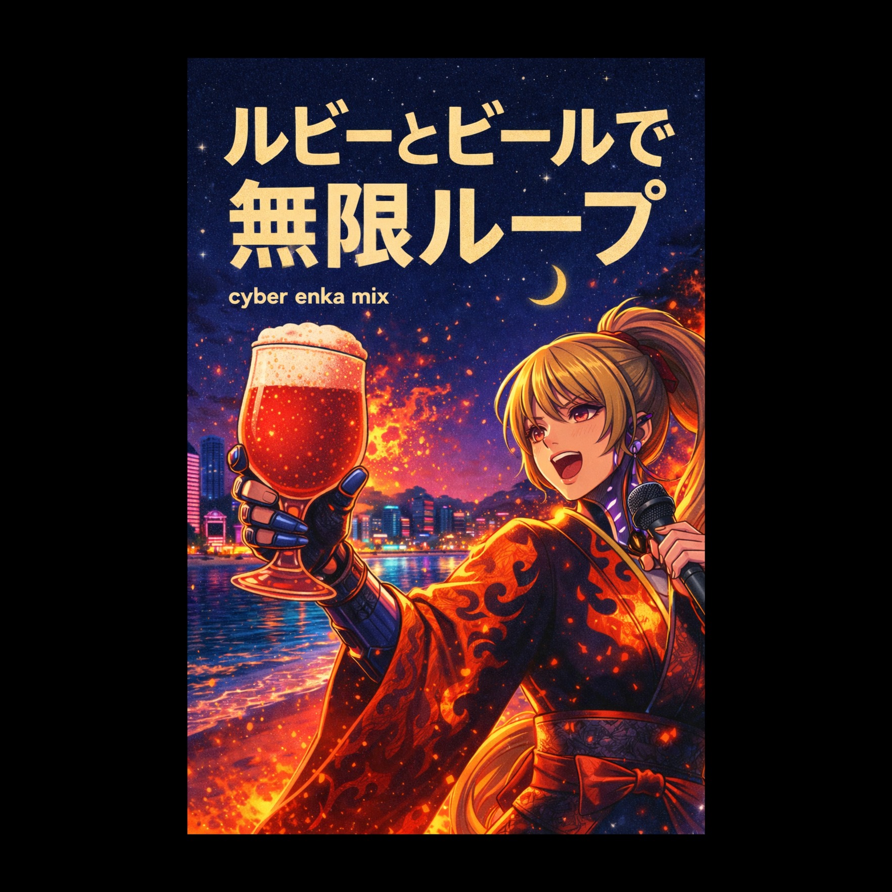 A cyber-enka trance fusion blending emotional Japanese enka vocals with futuristic trance textures and traditional Japanese instrumentation, Features a strong female enka singer with powerful kobushi vibrato, expressive phrasing, and dynamic shifts throughout, Set at BPM 124, combining 4-on-the-floor EDM grooves with enka-style melodic phrasing, Instrumentation includes processed shakuhachi, electronic taiko, minimoog bass, glitch percussion, and a shimmering layer of arpeggiated koto, adding rhythmic and melodic flow in place of electric guitars, Reversed taiko loops, AI voice chops, and layered vocal harmonies intensify transitions, Effects such as digital reverb, dry delay, glitch FX, stereo wideners, and sidechain compression enhance the cyber feel, Mood is nostalgic yet forward-looking, evoking scenes of lost love and neon-lit fate in a hyperstylized Japanese future, Perfect for anime endings, emotional stage performances, or chill-out enka electronica with a dramatic twist