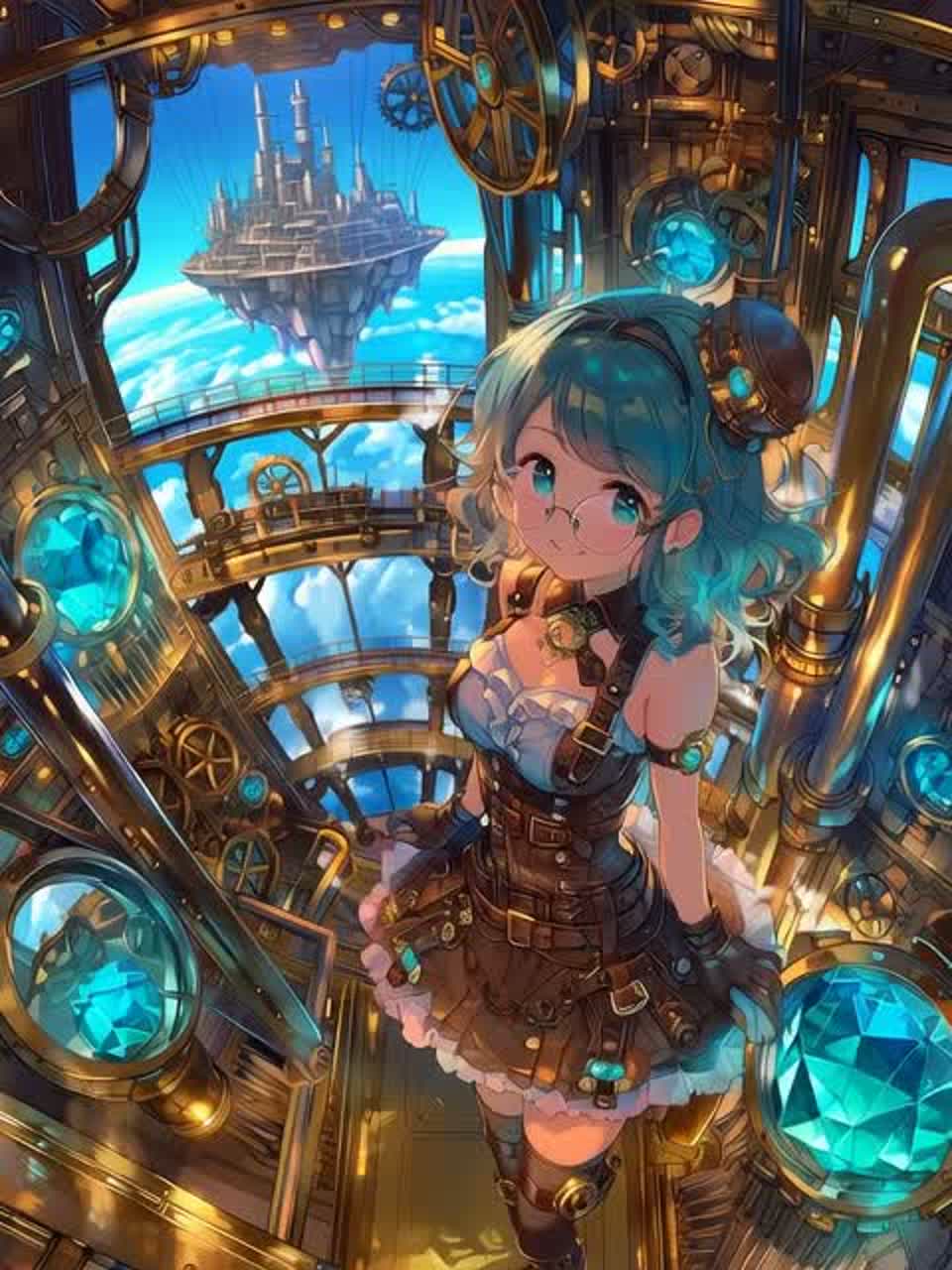 A steampunk-driven anime opening theme where mechanical sound design dominates the rhythm: constant clock ticking forming the hi-hat pattern, massive airship gear grinding and metallic clanking as primary percussion, heavy piston thumps acting as kick drums, sharp valve click-clacks and pressure-release steam bursts layered throughout, industrial steam engine pulses driving the groove, brass fanfares and low cinematic strings rising above the machinery, vast open-sky atmosphere with adventurous RPG airship travel energy, shimmering crystal-like synth accents glowing like Blue Topaz power cores, explosive chorus with mechanical propulsion intensity, combining ticking clockwork precision, roaring steam power, and soaring aerial freedom