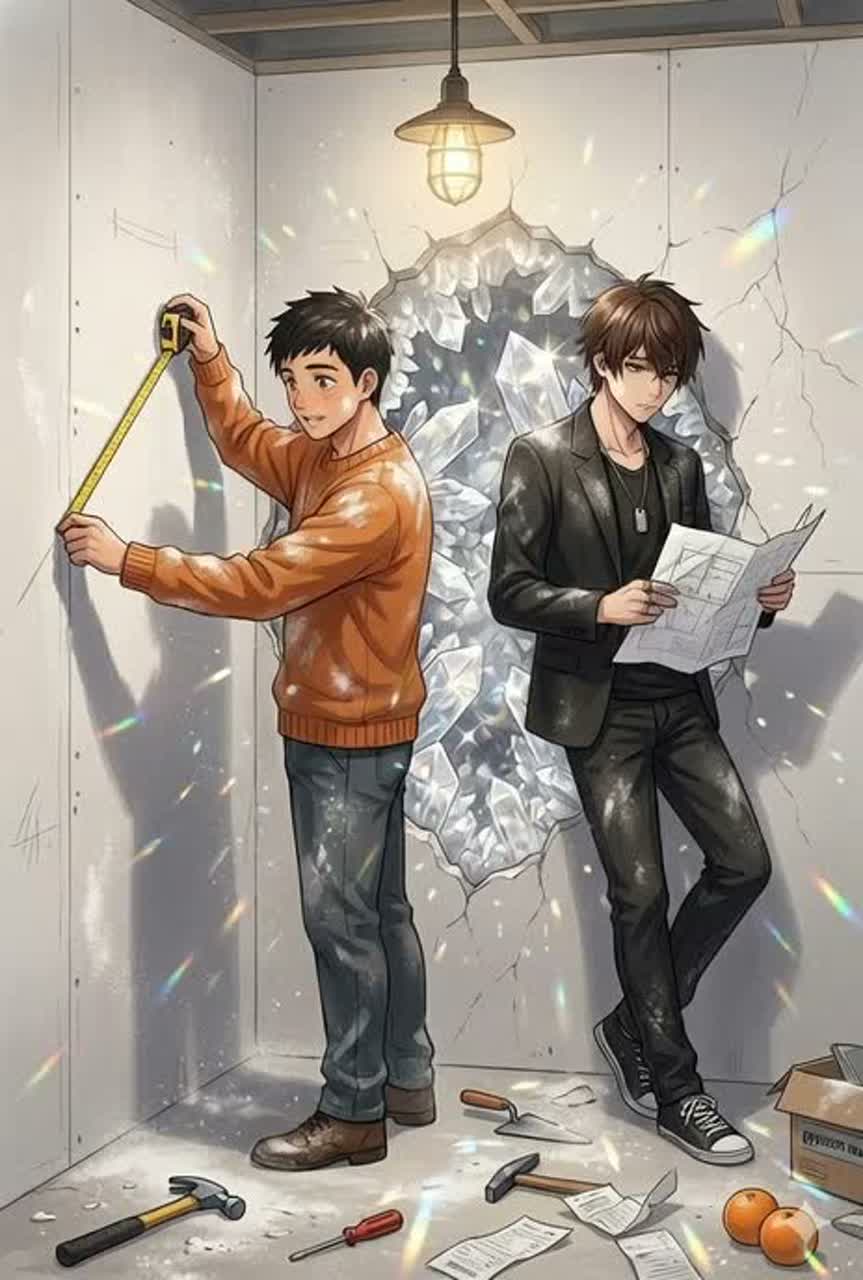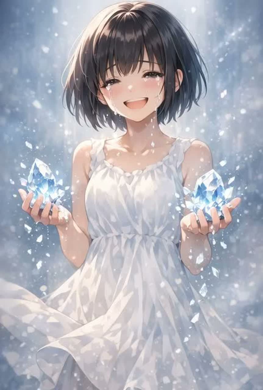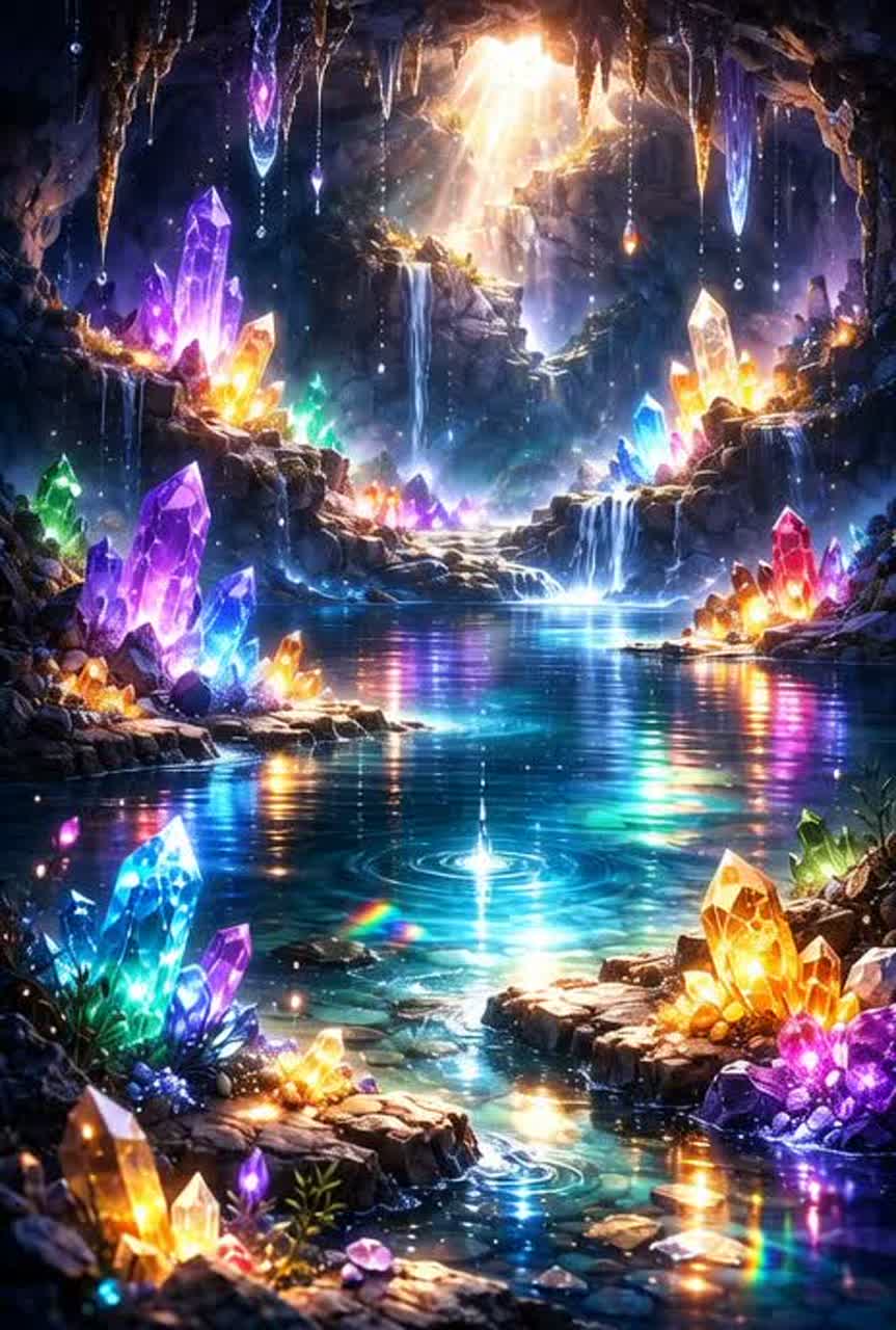 Crystal cave, underground lake, prism light, drifting droplets, suspended silence