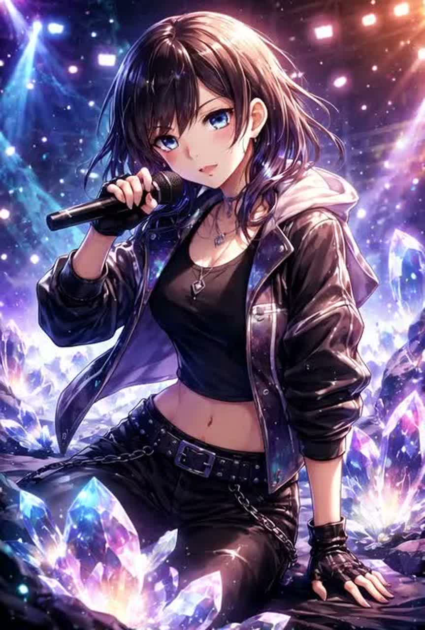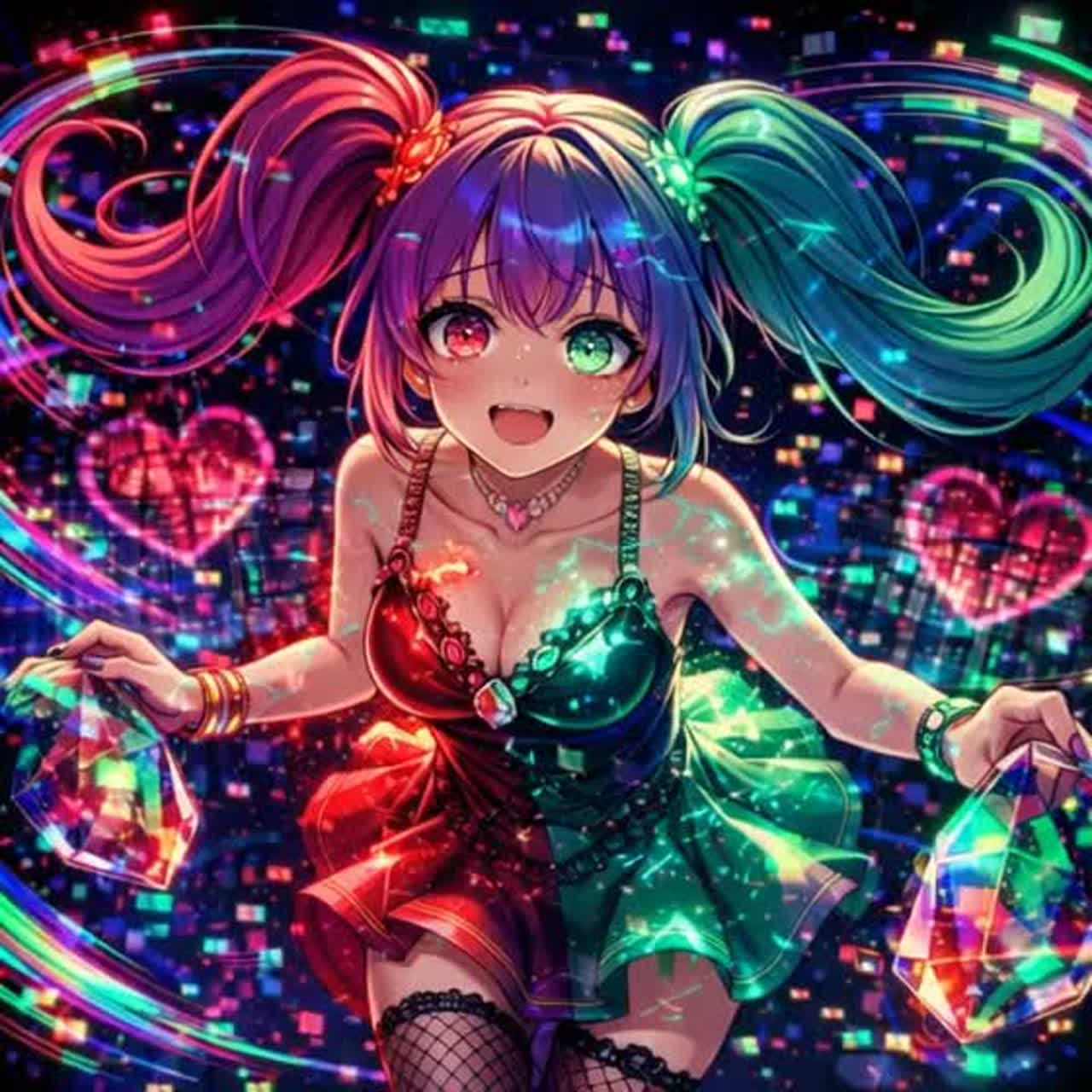Hyper-energetic Avant-Garde Bass House × Dark Future Bass fused with aggressive Breakbeats and Hardcore at high BPM (160–170), featuring punchy distorted kicks, elastic sub-bass, rapid glitchy fills, and sparkling prismatic refraction textures inspired by alexandrite, with crystalline resonance layers and iridescent harmonic shimmer, dual-phase modulation that shifts between warm red-glow supersaw leads and cool emerald-tinted plucks to emulate the gemstone’s color-changing nature, light-reactive sound design where filters and tonal balance morph under rising “intensity light, ” shimmering bell arpeggios, twinkling fantasy-like chime accents, bubbly kawaii synth stabs, and glossy candy-coated textures, contrasted by explosive hardcore drops with chaotic bass modulation, layered with cute yet unhinged female vocals that switch between sugary whispers, playful chants, melodic hooks, and manic laughter, creating a glittering, addictive, color-shifting club anthem that feels sparkly, sweet