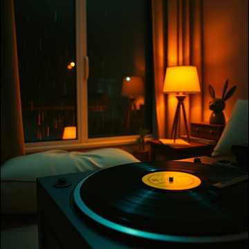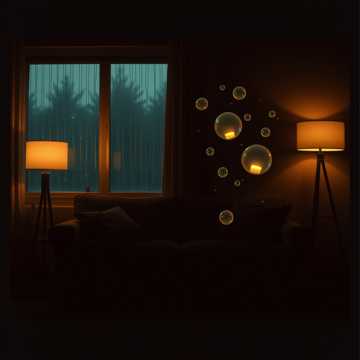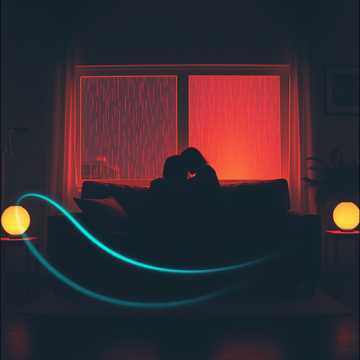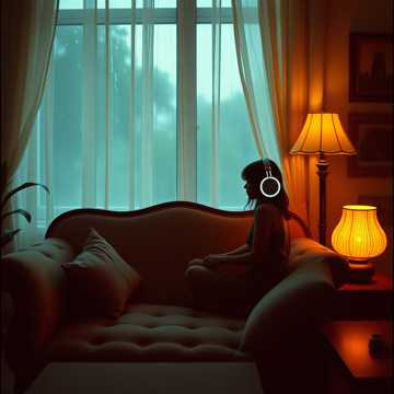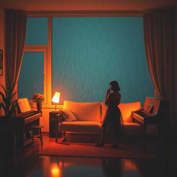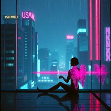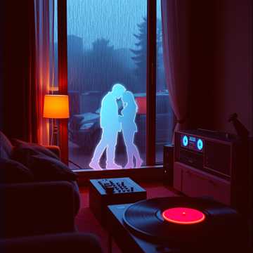 115 BPM lo-fi romantic trap with deep but relaxed 808 sub-bass, soft punch kicks, and mellow snare hits, Ambient rain SFX, distant thunder textures, and reverb-washed synth pads, Electric keyboard chords feel melancholic and warm, paired with smooth synthwave layers, Metallic pipe hi-hats echo like rain on steel, wind chimes drift slowly, Pulsing beats remain gentle and hypnotic, Emotional, cinematic, futuristic night-city atmosphere