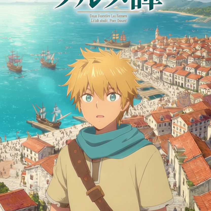 Morning sunlight spills into the cobbled streets as fishermen call out cheerfully and the protagonist walks by with a basket of fresh goods, A tiny fairy flutters through the air, and children’s laughter echoes through the lively port town, Prompt: