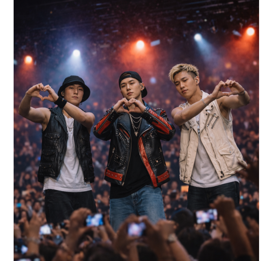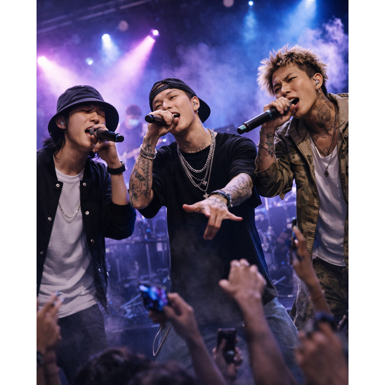 - Member C: hype rapper with ad-libs, shouts, and crowd interaction