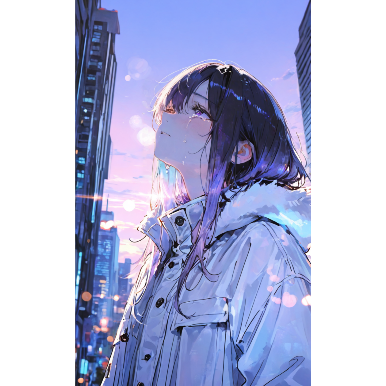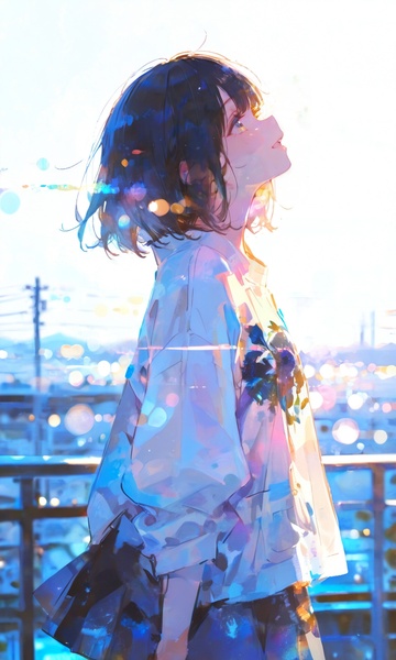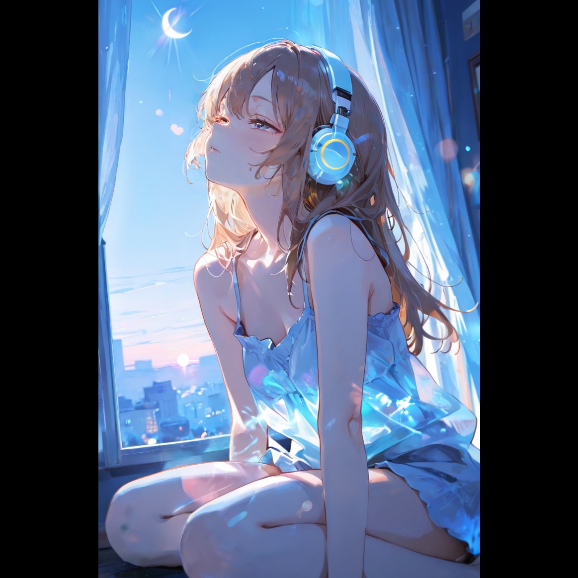 Atmospheric J-electro / emotional electronic music, Soft, airy female vocal, A quiet city at night, blue room lights, morning haze, fragile emotions shifting toward dawn, Shimmering synths, soft pads, glittering arpeggios, deep sub-bass, gentle kick, A floating, transparent mood with emotional depth, Calm but dramatic, nocturnal, introspective, cinematic