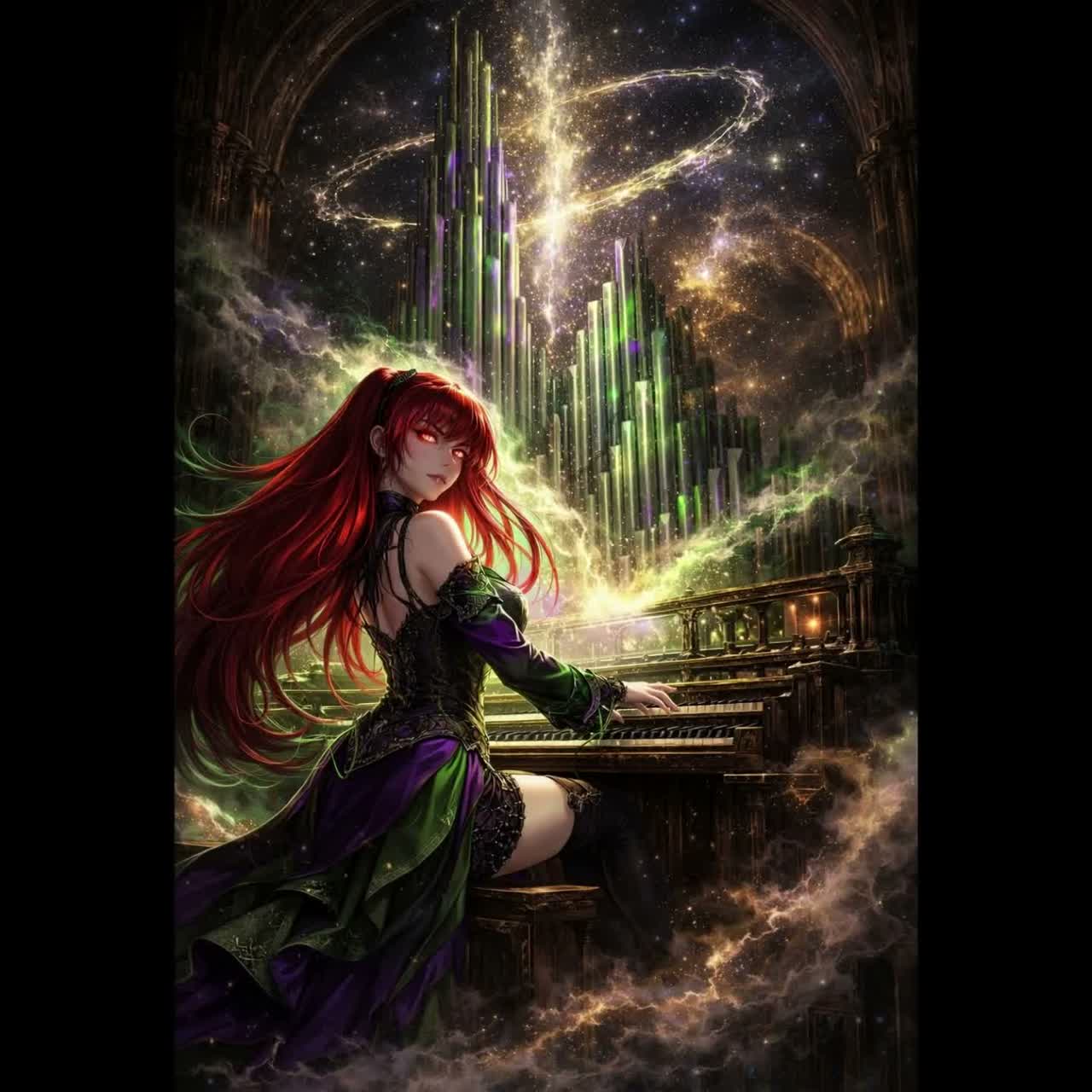 Modern dark symphonic electronica with cathedral pipe organ as the central force, Breath enters metal pipes and becomes resonance, expanding into cosmic texture, No drill rhythms, Slow evolving percussion, deep cinematic low-end, fractured glitch atmospheres, analog darkness, Organ tones stretch and bend like matter forming, Controlled, haunting female vocal β clear, defined, restrained, Mid-song rupture with distorted organ pulses and abstract electronic break, Final section dissolves into solo organ and air noise as the performance stops in vast silence