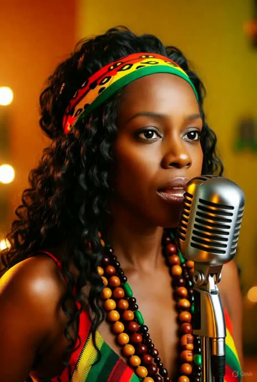 A 70s-style roots reggae song with a soulful female vocal, Slow tempo (80 BPM), warm groove, organic sound, Instrumentation:guitar, bass, drums, and organ keyboard, Mood: uplifting, earthy, nostalgic, and deeply human — like a sunset on a Caribbean porch