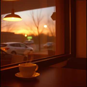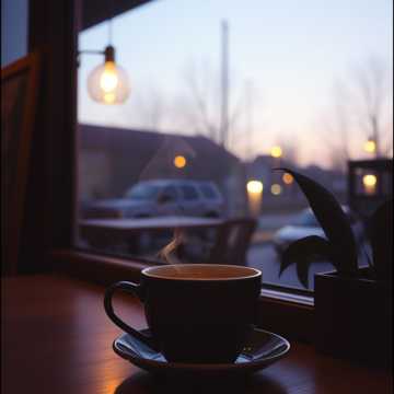 Soft hip-hop drums with light snare and hi-hat shuffle, warm Rhodes chords, mellow jazz guitar licks, and smooth sub-bass, Vinyl hiss and faint coffee-cup sounds create a cozy café mood, A short synth lead mirrors the hook, adding subtle bounce, Vocal Style:
