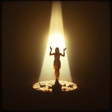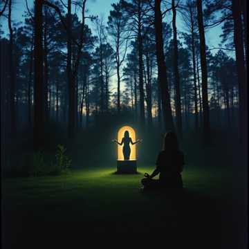 MPB de protesto espiritual com trance afro-indígena consciente, Fusão Bahia e Amazônia, Tempo médio, pulsação de caminhada e discernimento, Atabaques de Candomblé firmes e espaçados, Percussão tribal circular e orgânica, Violão de nylon rítmico com reverb quente, Guitarra psicodélica sutil, abrindo camadas de consciência, Vocal feminino potente, lúcido e profético, Momento central de fala divina didática e clara, Brasil profundo, espiritualidade prática e encarnada
