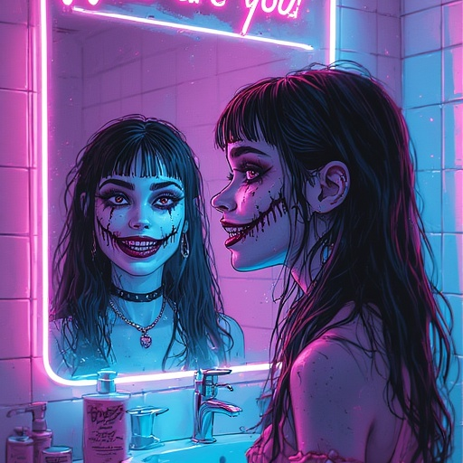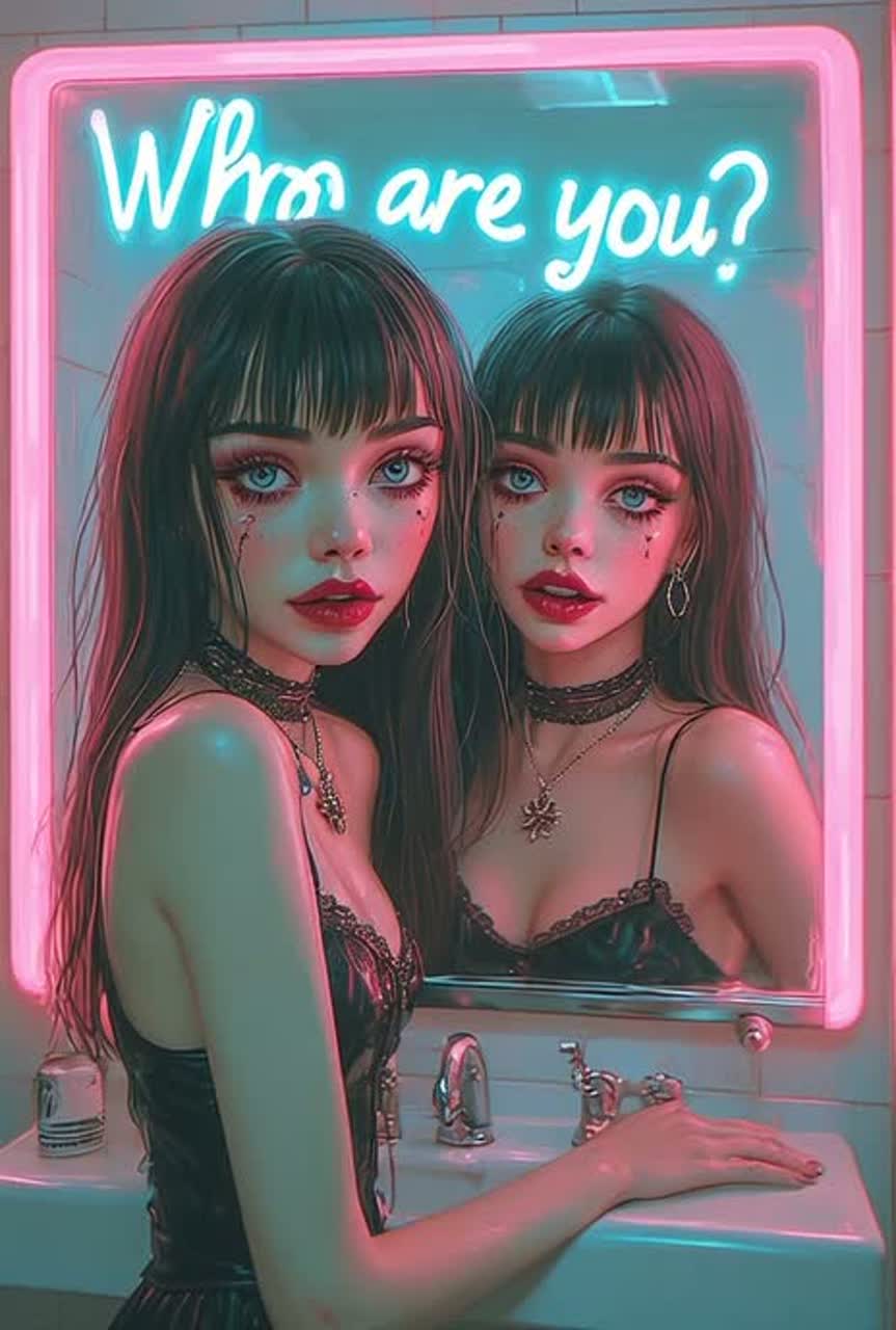 Genre: Dark alternative math rock with electronic horror elements, blending haunting indie pop introspection, experimental art rock surrealism, and industrial electronic intensity, Uses binaural and stereoscopic effects to build unease, Music Cue: Eerie, building tension; start minimal acoustic guitar whispers, escalate to synth waves, heavy bass drops in chorus, distorted guitars in bridge, Tempo 98-140 BPM, minor + major keys for dissonance, Mood: Psychological paranoia, identity crisis, haunting introspection, escalating dread and duality, Instruments: Female ethereal vocals with whispers/echoes, reversed piano, fiddle, pulsing synths, deep bass, glitchy electronics, reverb-heavy drums, mirror-like and crystalline sound effects (reflections, shatters, square-wave distortions), Add choral backups in build-up