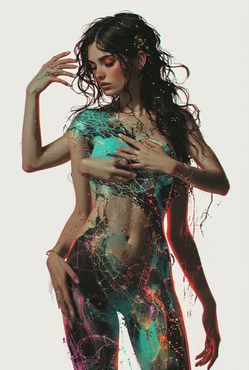 finger plucked acoustic guitar, sinewave, retro wave, synthwave, piano bar, glam rock, early 80s techno, 80s pop, dark pop, Sub-Genres: dark fantasy / Electronic technical dark jazz / heavy Djent/ illbient fusion, Blends pulsing distorted electronic beats, lush ambient layers, and improvisational jazz for a cinematic, bombastic vibe with intricate, glitchy undertones and melodic arpeggios, Music: Mid-tempo, uneven pulses, dynamic shifts from chaotic highs to quiet lulls, Starts with jagged synths, builds with layers, ends in eerie silence, Solos mix frenetic jazz with electronic swells, Instruments: