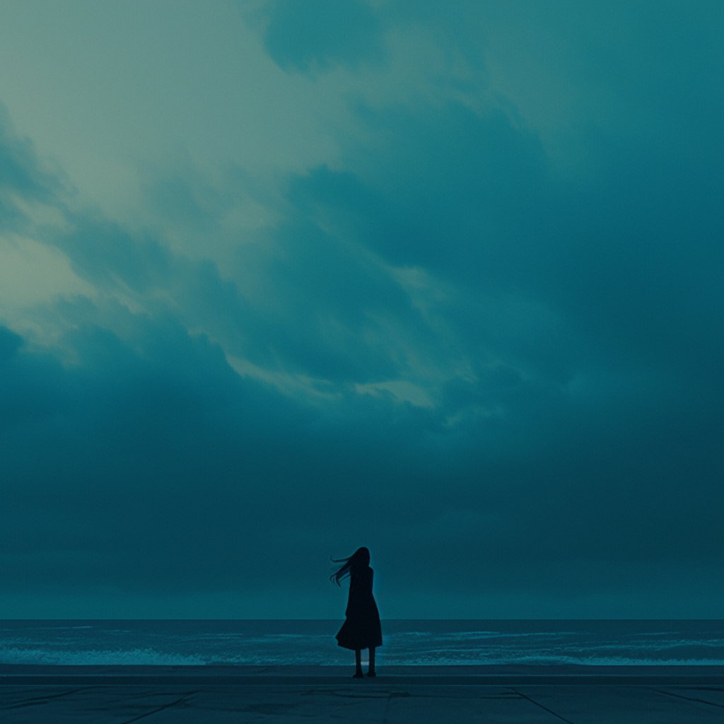 Create a live concert version of the song “海へ”, placed as the 10th track in a setlist, The previous songs were heavy and loud, but this one marks a turning point into a dreamy, ambient pop atmosphere, Audience of 800–1000 people is gently immersed as lights dim and a soft mist rolls across the stage, Before the song starts, include a short MC in Japanese by the vocalist (persona: deep-sea fish, "Toto Fukami")—calm, introspective, and connected to the sea and loneliness theme of the song, Use ethereal ambient pop / shoegaze style with lush synth pads, delicate arpeggiated synths, subtle textures like ocean waves and distant seagulls, Keep tempo slow (~75 bpm), Vocals are reverb-rich, floating, melancholic but hopeful, The live venue acoustics should enhance the spaciousness and dreamlike soundscape, End with extended outro of ambient ocean textures fading into silence