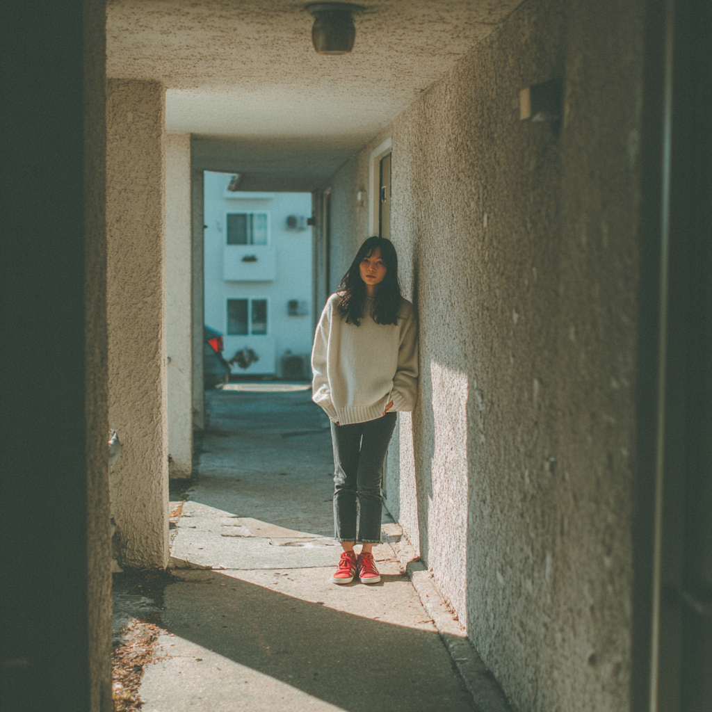 Live version of a melancholic Japanese folk-rock ballad performed by a female singer-songwriter as the 4th song in a concert set at a mid-sized live venue (800–1000 people), Emotional whispered vocals that become breathy and unstable during emotional peaks, Dark, urban atmosphere, Replace the acoustic guitar with a distorted electric guitar, warm but gritty tone, Piano remains soft and reflective, Minimal percussion with a slow, pulsing tempo, Inspired by Japanese dark folk and Shibuya-kei influence, Include a short spoken MC at the beginning in a soft, thoughtful voice, Ambient live reverb with subtle audience presence, Intimate, cinematic, echo of loneliness lingering in the dark hall