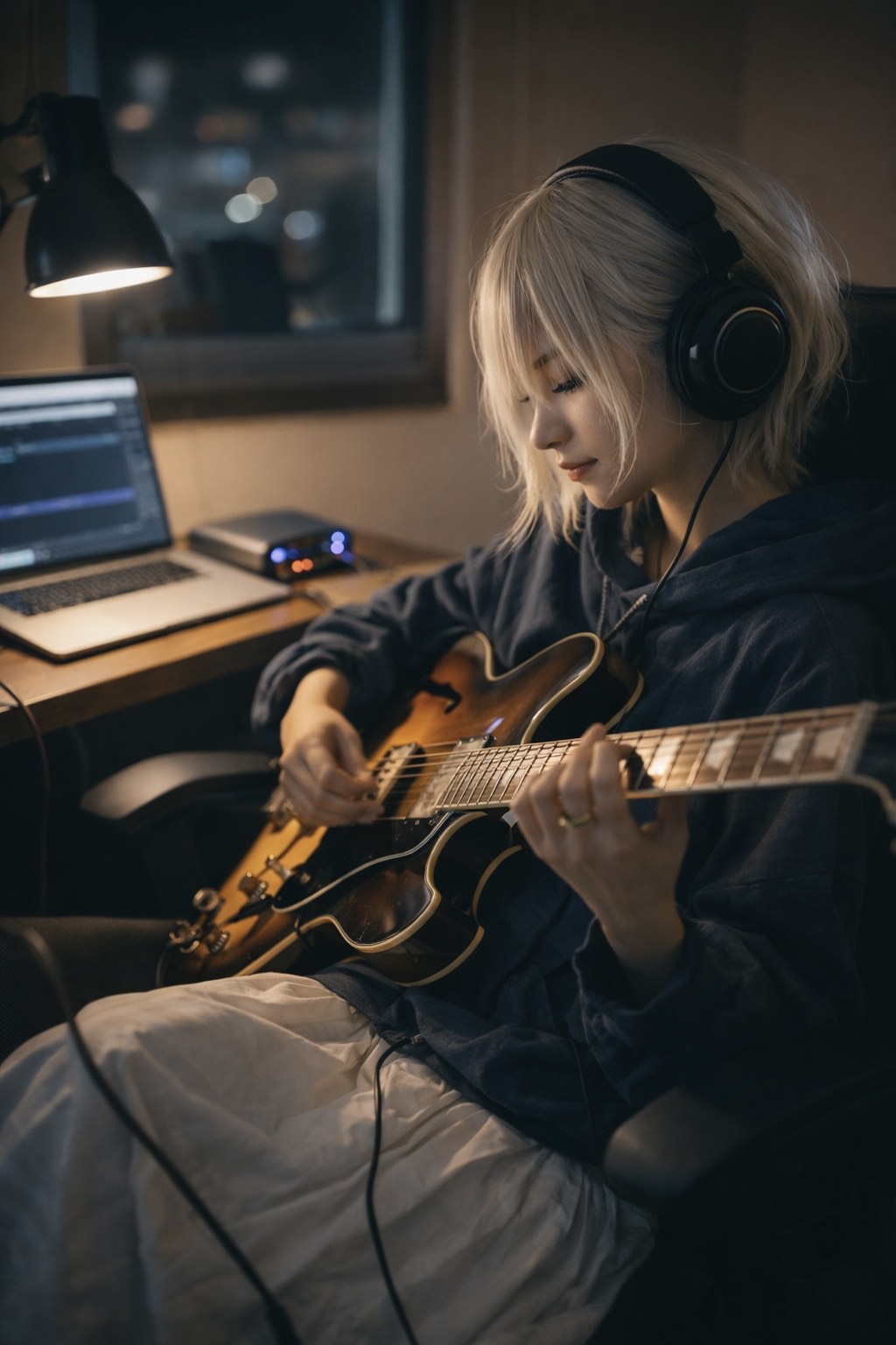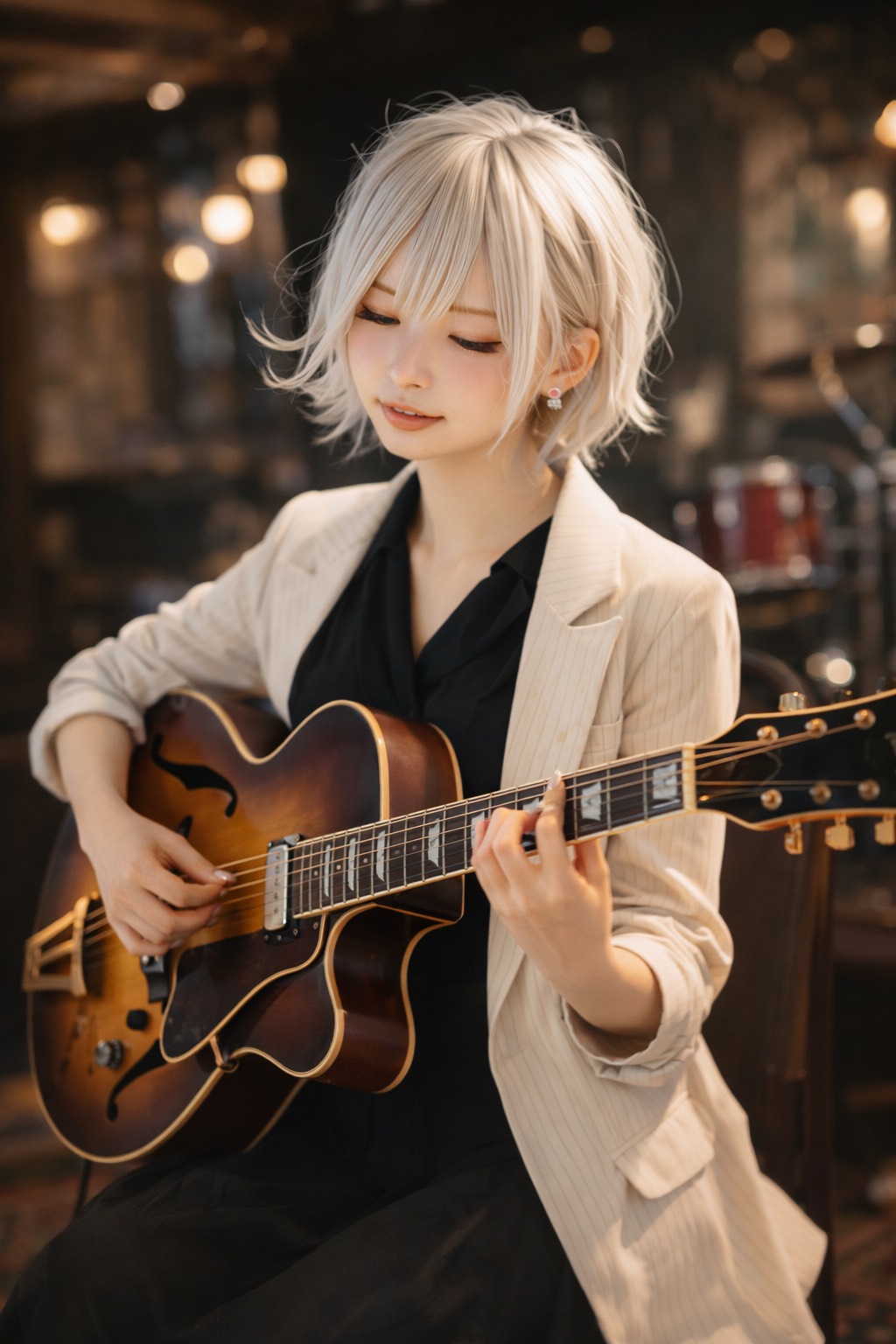 jazz, Ultra-intimate live-trio illusion: solo jazz guitar recorded close-mic’d, warm archtop tone with roundwound detail, Walking bass and chord melody weave beneath a smooth, smoky female vocal, Tempo in a lazy medium swing; verses sparse and conversational, choruses bloom into richer extensions and chromatic voice-leading, Occasional natural harmonics and sliding chordal fills answer vocal phrases, Roomy, club-like ambience; vocal dry and upfront with subtle plate sheen, rich, tone, smooth, fluid, vocal, minimal, sophisticated, harmony, fingerstyle