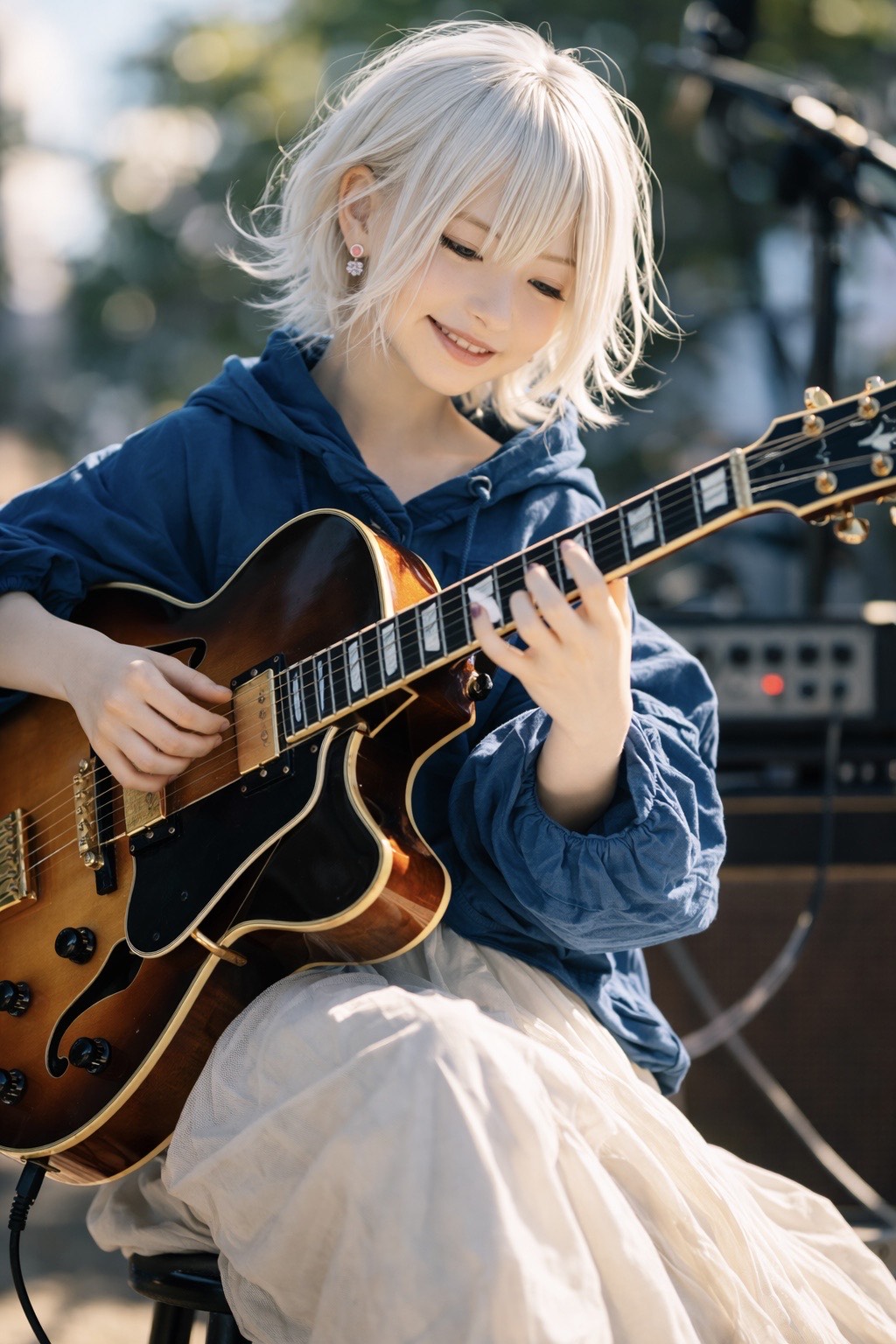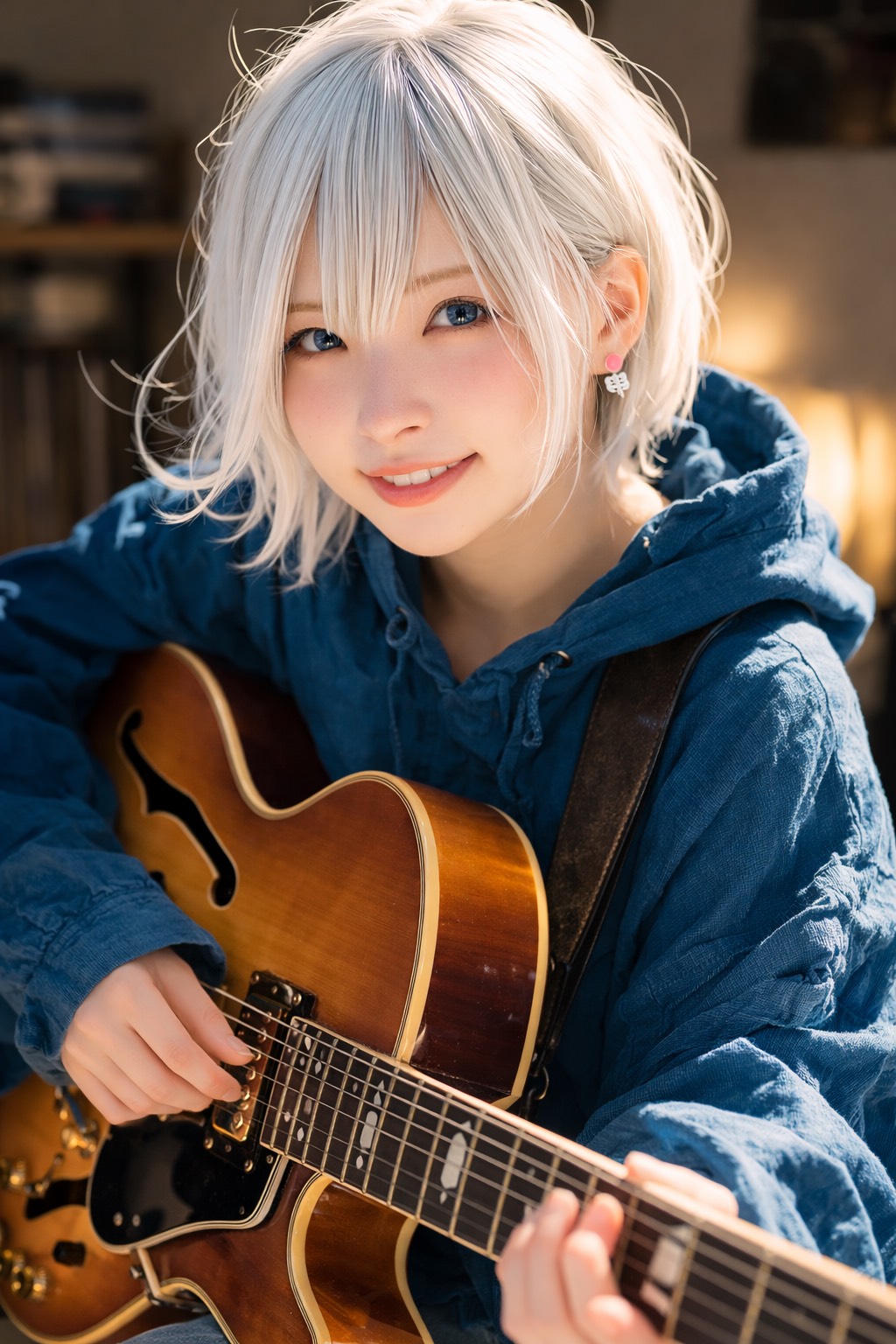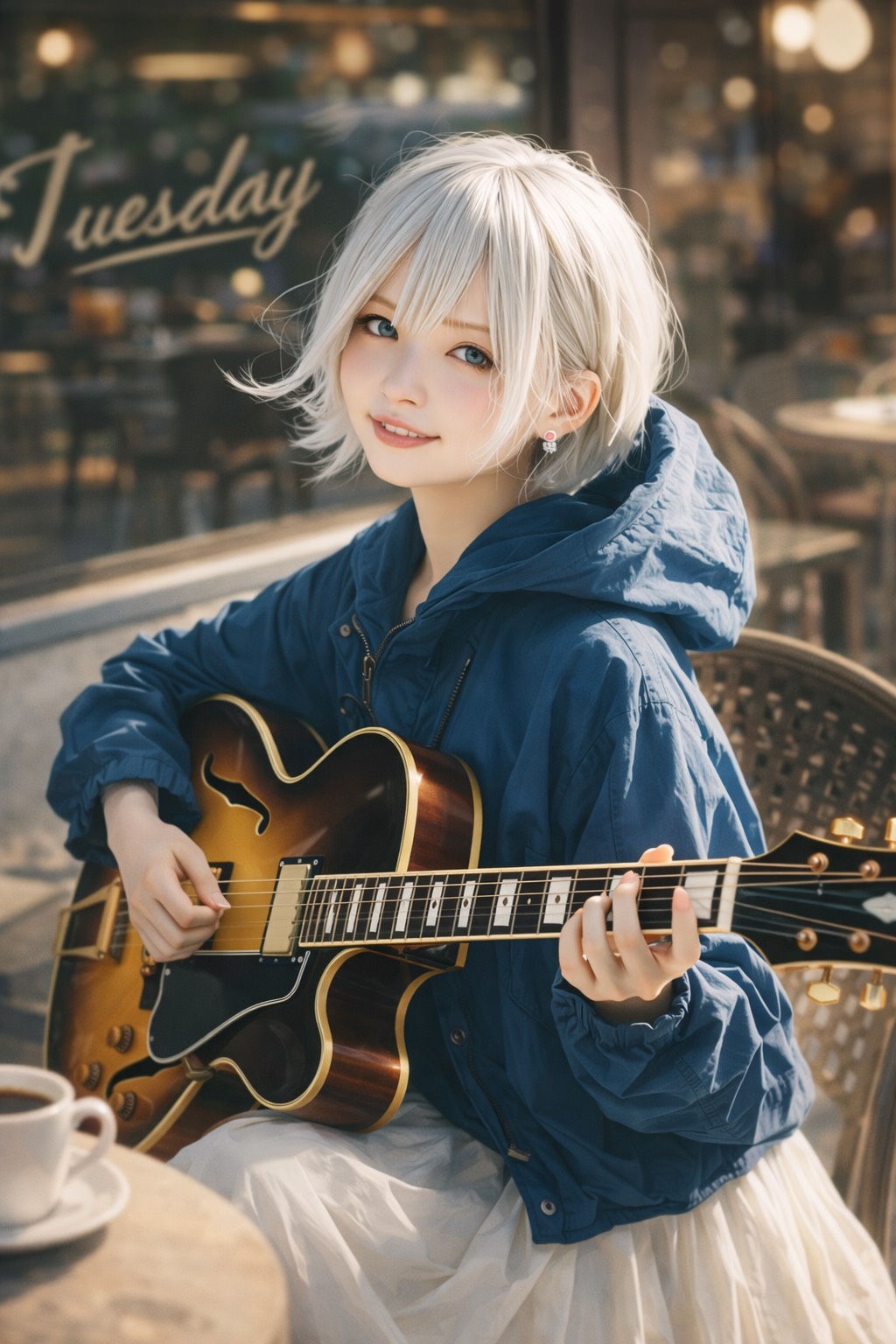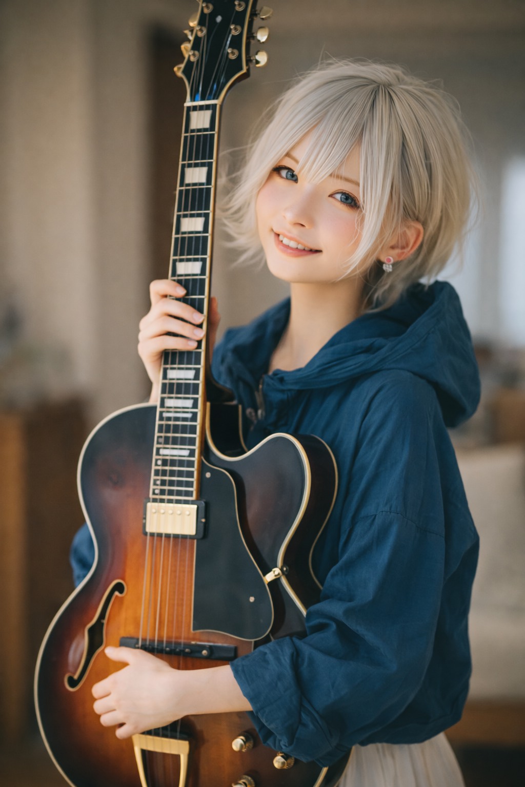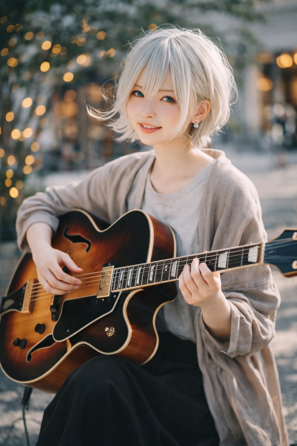 jazz, Ultra-intimate live-in-the-room feel; female vocals in a smooth jazz lane, close-mic’d and breathy, Solo hollow-body guitar with bright, articulate tone: walking bass on the low strings, chord melody extensions on top, inner-line movement connecting phrases, Verses stay delicate with space for rubato fills; chorus leans into lyrical, singable changes while guitar blossoms into richer 9–13 tensions, chromatic runs, and harmonics between every vocal line, Subtle room reverb, airy top end, and a late-song guitar-only improv tag that fades into hush, fingerstyle, vocal, rich, smooth jazz, tone