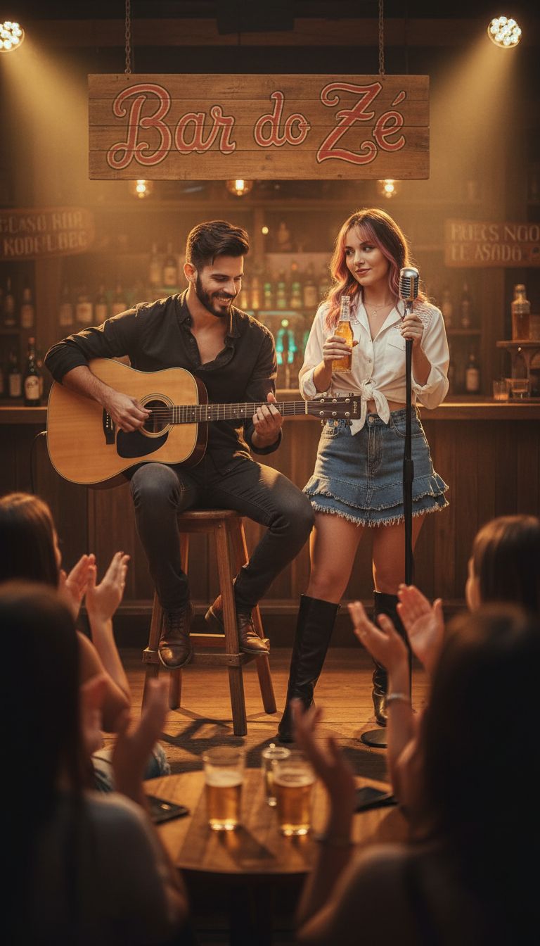 Upbeat country pop song blended with Brazilian sertanejo universitário, Female lead vocal inspired by the confident, playful and powerful style of n (reference only, not imitation), Prominent harmonica (mouth harp) riffs, acoustic guitar, electric guitar accents, upbeat drums, modern country groove, Theme: freedom, partying, drinking to forget heartbreak, “today I drink them all”, empowerment and fun, Catchy chorus, sing-along hook, bar anthem energy, Medium-upbeat tempo, joyful, bold, confident mood, Lyrics in Brazilian Portuguese with a few English expressions like “hey bartender” and “turn it up”