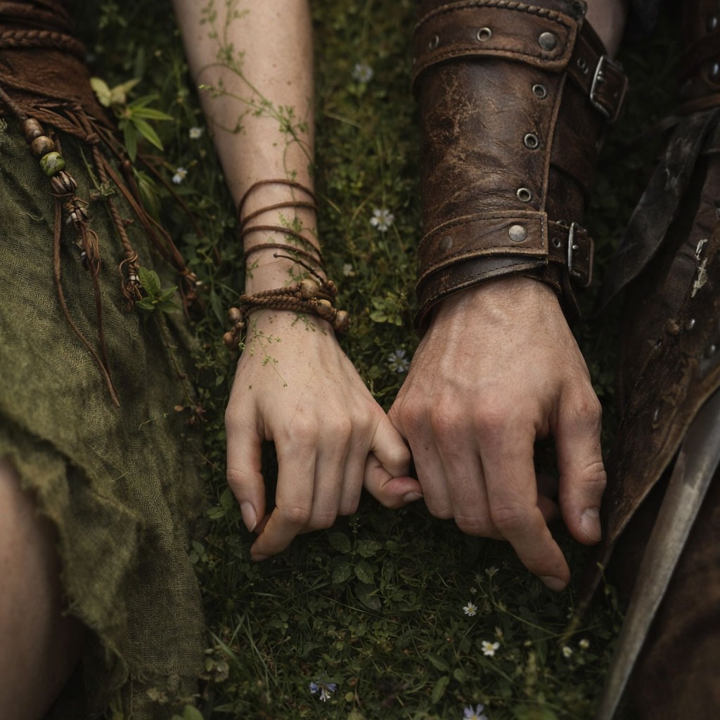 lofi bedroom folk pop, intimate male and female duet, warm mid-range male vocal, spoken-word leaning delivery, gentle melodic phrases, soft expressive female freestyle rap, journal-entry feel, dusty keys, vinyl crackle, muted guitar swells, soft bass, subtle lo-fi drums, faint bell or chime accents, warm tavern ambience, lantern-lit mood, quiet adventure, late-night calm, intimate and reassuring, finger snaps, whistling, harmonica accents