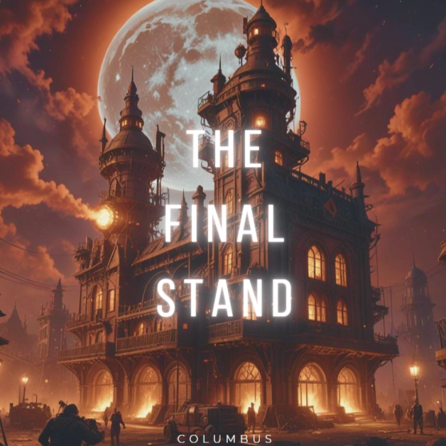 Epic and heroic battle anthem, male vocals with powerful choir, fast tempo, heavy orchestral strings/brass/percussion, driving rhythm, a sense of urgency and defiance, high energy and tension