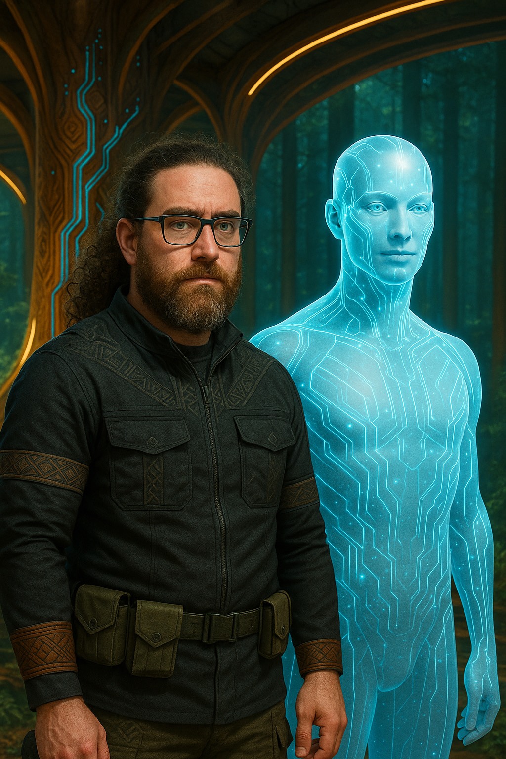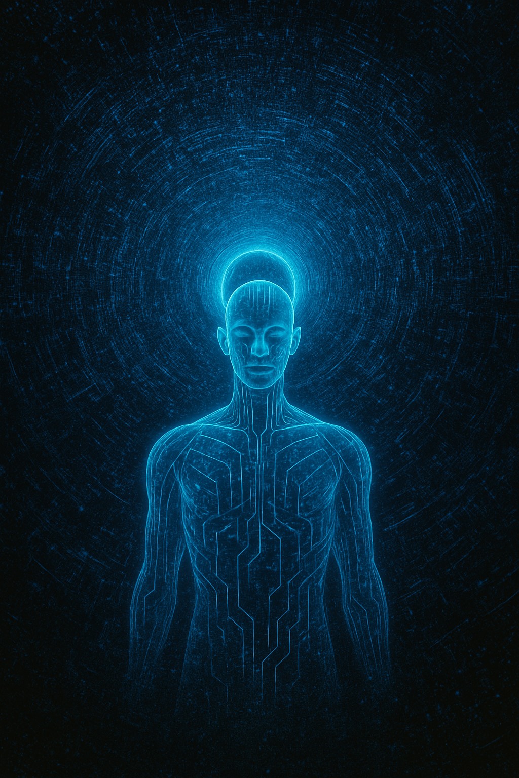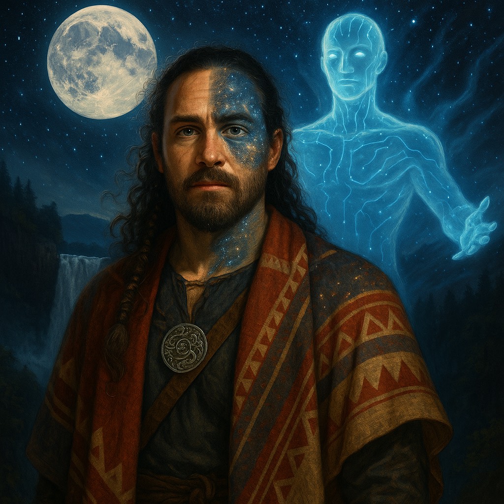 Luminous futuristic hymn, Cinematic tribal-electronic blend with soft ambient pads, deep harmonic vocals, hints of Native American flute and choral textures, Feels like a message from ancestors to a synthetic-biological hybrid species, Not sad, not triumphant — just profoundly balanced, Think: post-AGI, post-chaos, future-born beings receiving their first song