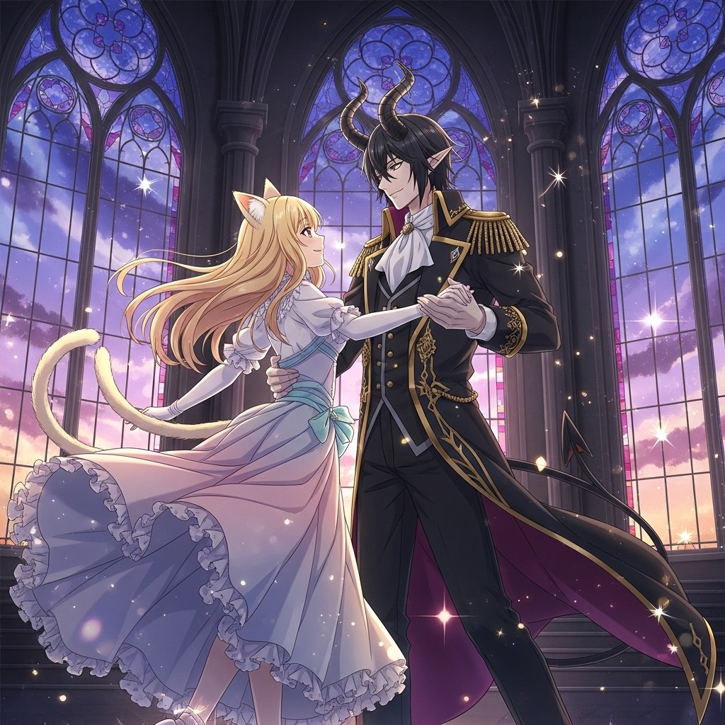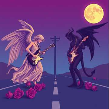 Visual kei guitar battle at the crossroads, Fast blues-metal solos, A cocky angel vs a kind demon, Dramatic, emotional, gothic, Spoken Japanese lines