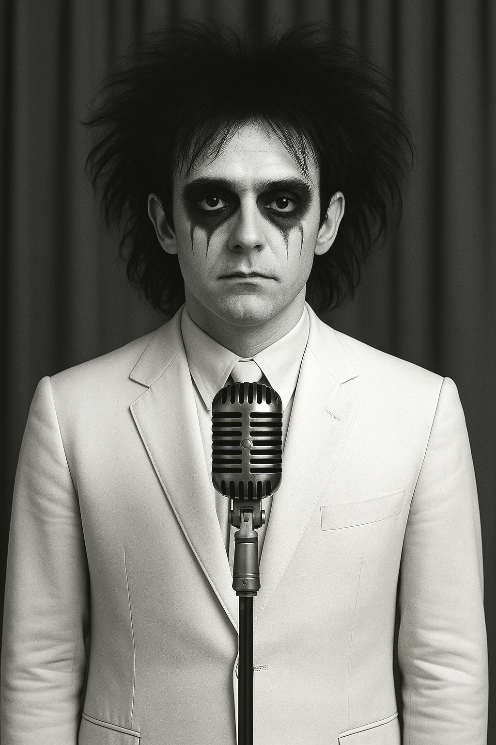 A classic 1950s doo-wop track mixed with post-punk / new wave / dream-goth with warm vocal harmonies, snapping fingers, upright bass, brushed drums, and smooth, nostalgic chord progressions, Lead male vocals delivered in a soft, poetic, emotionally bittersweet tone, Backing vocals add playful “doo-doo, ” “sh-boom, ” “wah-oh” phrases in tight harmony, Production feels vintage and analog — like a lost acetate recorded late at night in an empty diner, Slightly eerie atmosphere beneath the sweetness: gentle reverb, soft tape hiss, and a dreamy, haunting mood hidden under the cheerful doo-wop bounce, Overall vibe is romantic, strange, nostalgic, and beautifully off-kilter