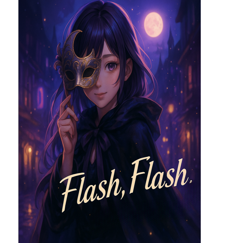 A mysterious and emotional Art Pop à DrumânâBass fusion, The track combines poetic, bilingual lyrics (Japanese-English mix) with fast-paced DnB rhythms (around 165 BPM), glitched textures, layered synths, and theatrical melodic phrasing, Female vocal with breathy softness yet inner strength, switching between spoken-like verses and melodic choruses, Emphasizes themes of transformation, masquerade, and identity, The arrangement features syncopated breaks, distorted atmospheres, and cinematic chord progressions, Imagine a nighttime city parade of costumed characters, each hiding and revealing parts of themselves, Elegant, chaotic, and deeply human