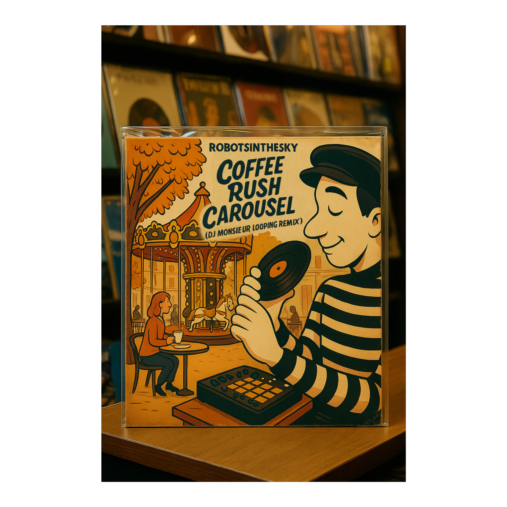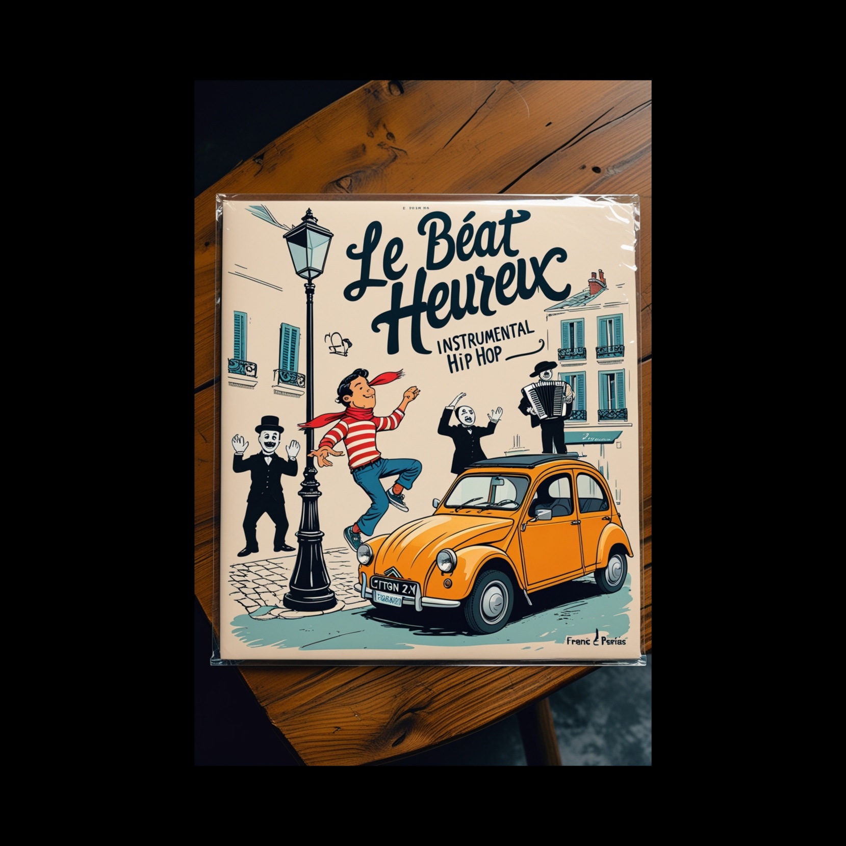 Hiphop rap crew trading lines between voices, playful turntablism, jazzy French dirty sloppy moody autumn vibe hip-hop with a cinematic Parisian café atmosphere and a HipHop Crew rapping in the streets, Mid-tempo lo-fi groove built from upright bass, brushed drums, muted trumpets, and vintage accordion riffs, Include soft French rap verses with poetic, humorous tone, Layer real café ambience: cups clinking, quiet chatter, carousel bells, radio static, espresso steam, Add MPC swing, vinyl crackle, and witty scratch hooks using French words (“Café”, “Soleil”, “Paris”, “Groove”), Middle bridge drops to near silence with soft whistle and carousel turning (like in the original), Warm autumn jazzy horns return for final chorus with conga shuffle and lazy trumpet solo, Final fade includes laughter, fading radio, and vinyl hiss, The mood: nostalgic, cozy, cinematic, and a little absurd — an autumn Sunday afternoon, moody dark with sunshine, industrial city scape