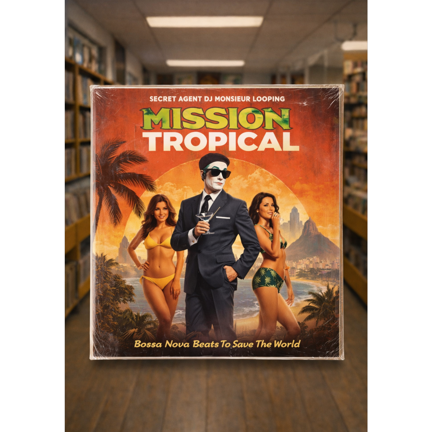 sexy slow 72bpm breakbeat instrumental abstract hip-hop track with a deep electro tropical beat, MPC style sampled sound-collage, spy-jazz cinematic strings and dark heavy brass, upbeat dark 60s big-band set in 1960s Brazil, silly James Bond parody meets OSS117 humor and French turntablist swagger, heavy head-nodding beat, sampled classic bossa nova rhythm as the foundation with nylon-string guitar playing syncopated live 60s French jazz, upright bass walking smoothly, soft brushed drums, shakers, agogô bells and light congas creating warm night-time Copacabana energy piano fills, tape saturation and vinyl hiss, subtle samba percussion introduced during action moments, turntable scratches cutting bossa chords and horn stabs, MPC-style sampled dusty Brazilian radio voices, dramatic spy-film brass hits and cinematic strings, playful French presidential radio samples appear and disappear, female whispered vocals seductive and sexy but classy, comical fun vibe, scratching, French-jazz, ‑pop, ‑funk, ‑rock, ‑metal, ‑techno, ‑house, ‑boring