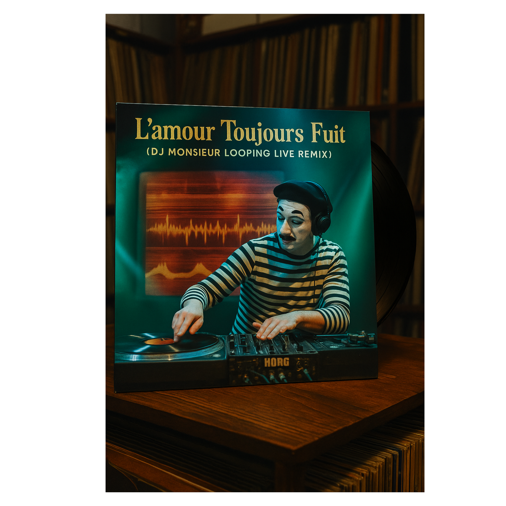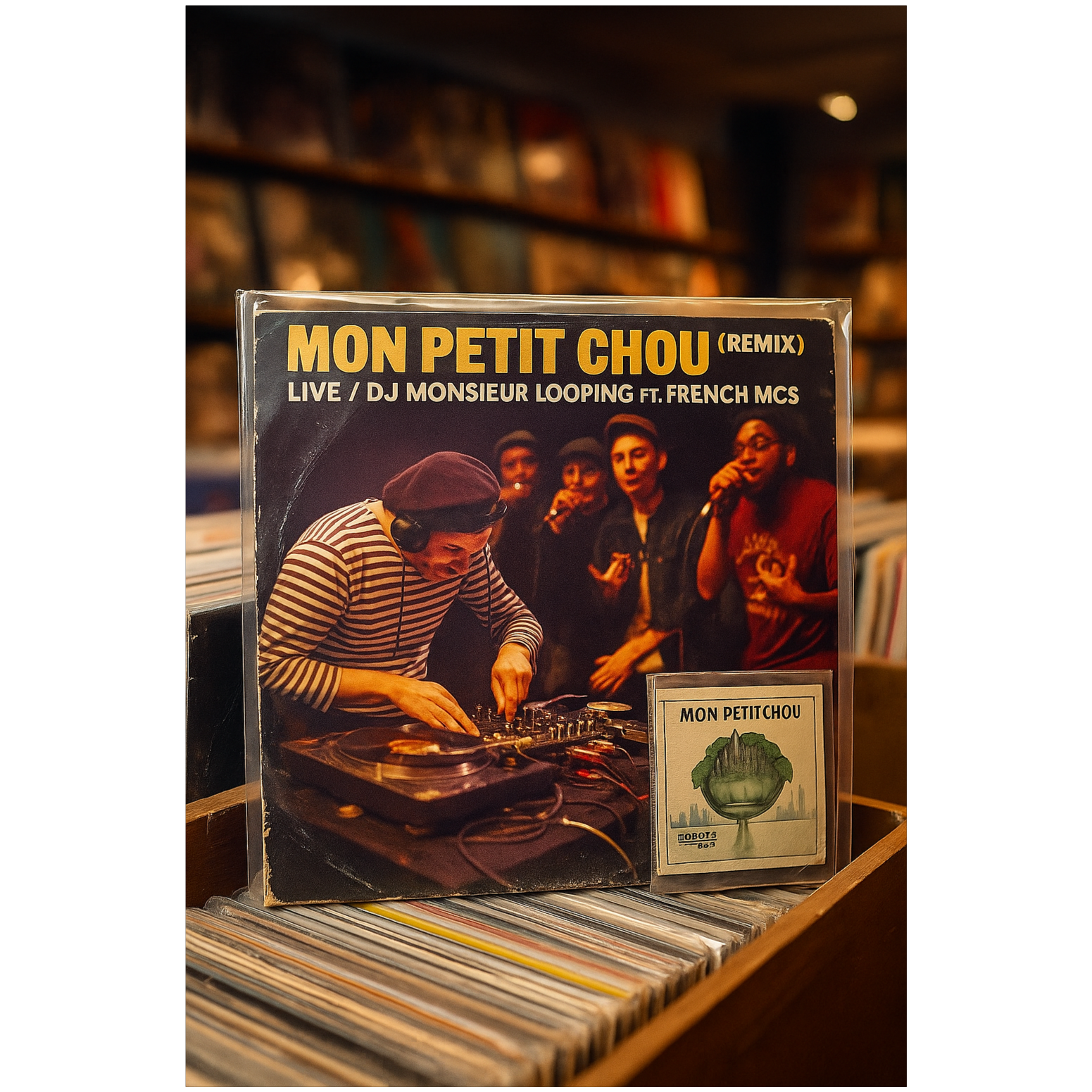 Live French hip hop remix, DJ turntablism with scratching and looping, funky sample-based beats, playful French rap vocals, energetic MC hype, live crowd vibe, Funky turntablism live performance, creating beats out of scratching, creating melodies from vocal scratching, vinyl scratching as drums and melody, chopped French chanson loops, scratch built basslines, rhythmic vocal cuts, looping fragments, live beat juggling, dusty vinyl crackle, boom bap groove with experimental scratch textures, call and response turntables, crowd shout samples, French spoken word snippets, analog warmth, funky scratch orchestra vibe, performance energy, DJ Grazzhoppa Big Band meets Cut Chemist, turntable as instrument, scratching syllables into rhythm, hip hop scratch session, playful and groovy, live raw vinyl feel