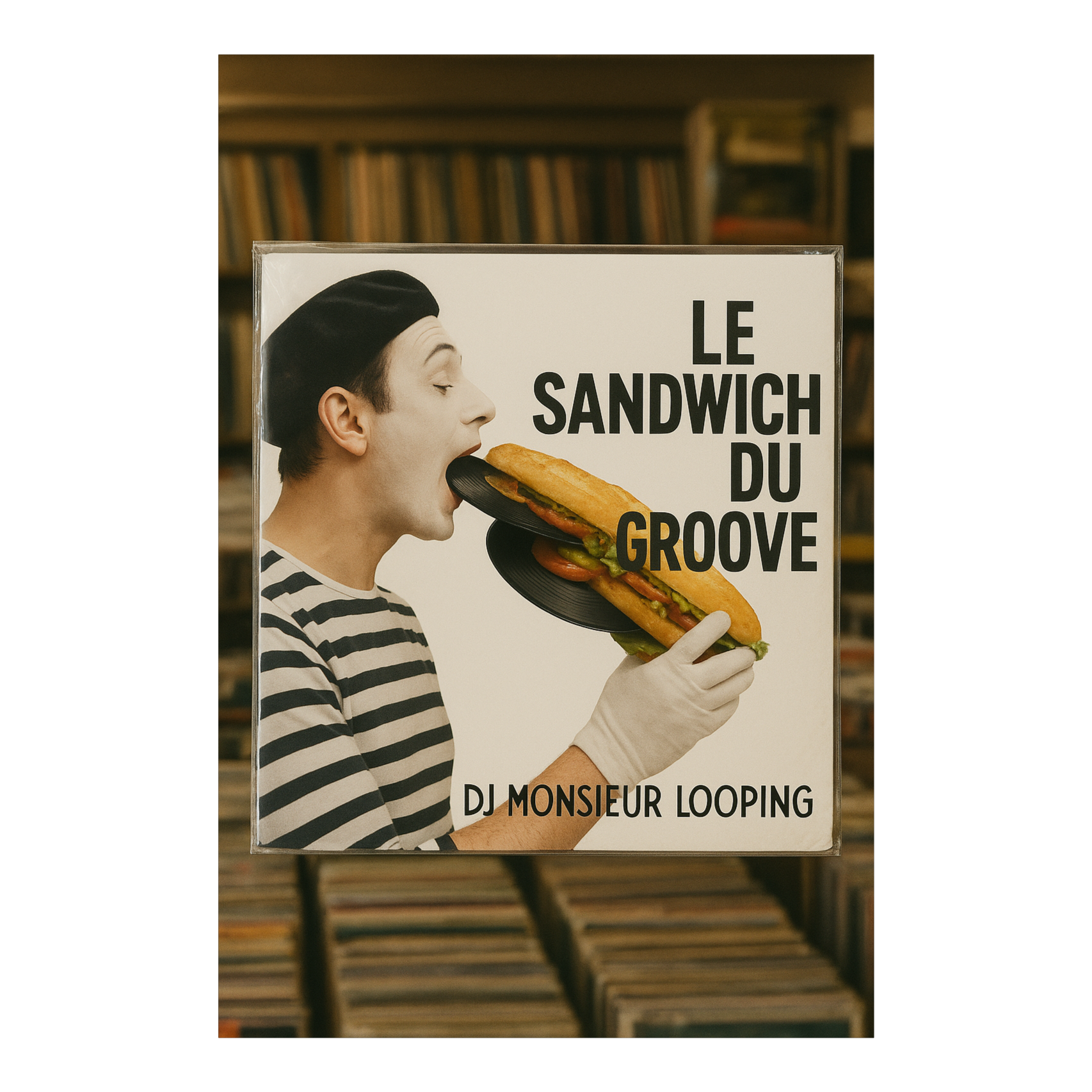 chopping up sentences in multiple sample pieces with MPC, Playful dirty gritty dark French instrumental heavy hip-hop track built from 1960s jazz, chanson, and comedy samples, Gritty chopped up MPC swing with upright bass, dusty brushed drums, chopped accordion riffs, and muted trumpet stabs, Includes snippets of old radio shows, laughter, and vintage cooking dialogues, woven into a funky groove collage, Accordion and trumpet answer each other over a warm lo-fi vinyl texture, Scratch FX create rhythmic “sandwich” cuts between phrases, mixing old-school turntablism with French humour, Mid-tempo, bouncy head-nod beat, like a Paris café jam turned into a hip-hop cartoon, Add congas, guitar licks, and tiny dialogue cuts for a layered cinematic feel, The mix feels analog, dusty, and warm — jazzy, funny, and irresistibly groovy, with tape hiss, stereo motion, and vintage charm, ‑pop, ‑funk, ‑rock, ‑metal, ‑techno, ‑house, ‑boring