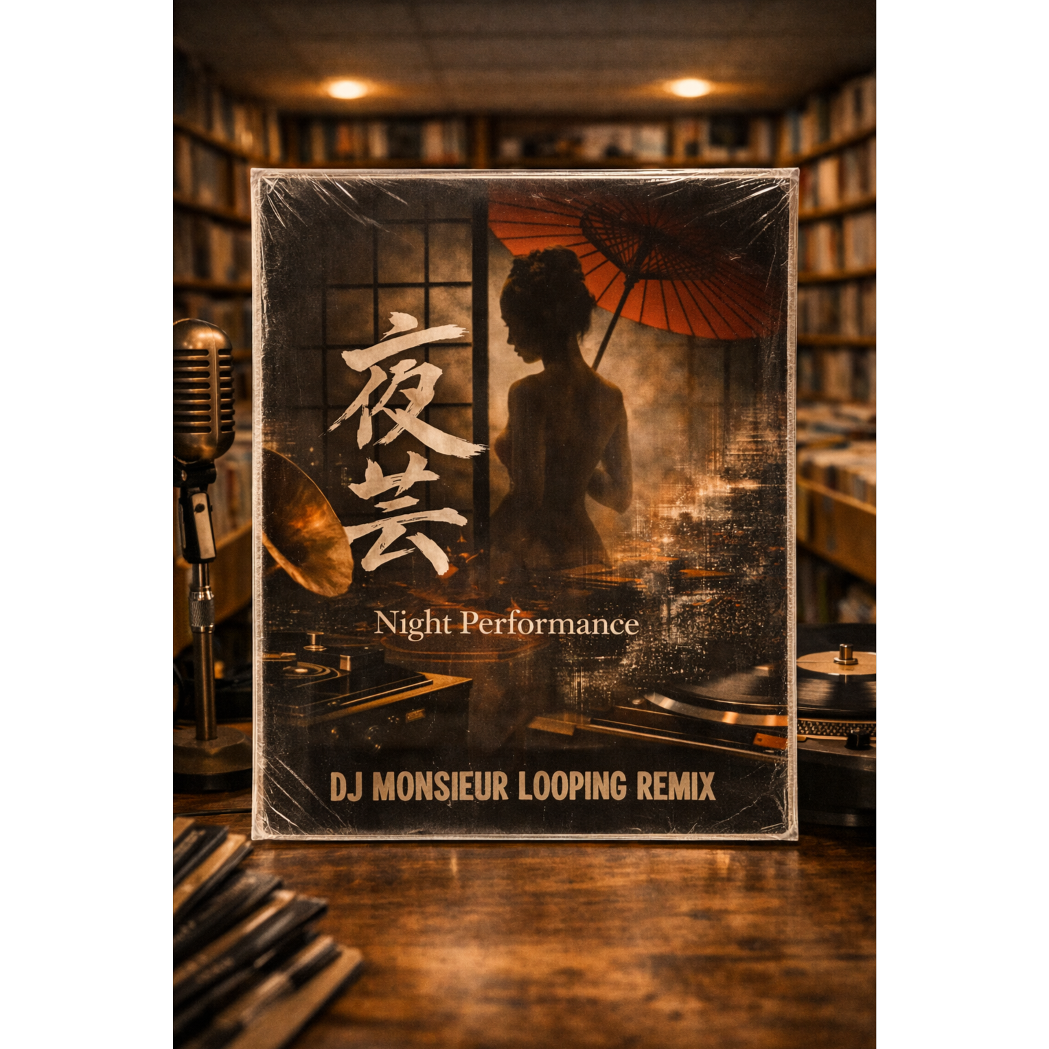 remixing a Japanese traditional geisha song by sampling old dusty 1920s bad quality gramophone records, vinyl samples mixed with sampled cut and paste sound collage MPC style loops and snippets of 60s lounge jazz and French chanson, mixed with modern hard electronic instrumental hip hop beats, it Begins with intimate chamber setting, female geisha vocal, Kokyū bowing, wooden room ambience, Gradual transition introduces upright bass, 808 sampled mpc brushed jazz drums, cut Rhodes chords, muted trumpet pads, and soft jazz guitar, electro Beat emerges mid-tempo with dusty dark hip hop kick, brushed snare, chopped Kokyū loops, broken vinyl wobble textures, and rhythmic vocal fragments used as percussion, Groove combines Tokyo night atmosphere with Paris lounge energy, cut up big band brass accents, jazzy bass walking lines, live turntable scratches, dark strings cinematic spy-lounge tension, Instrumental section layers shakuhachi breaths, taiko-style hits, MPC sampled glitch Rhodes solos, ‑pop, ‑rock, ‑metal, ‑boring, ‑sad, ‑lounge