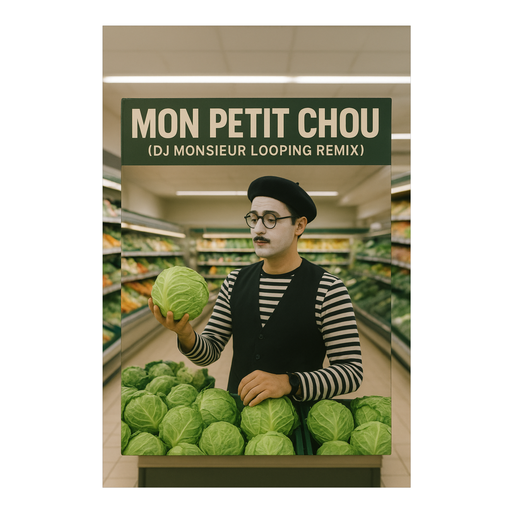 chill jazzy boom bap, vinyl crackle, MPC chops, vintage French chanson samples, swingy piano loops, upright bass, brushed drums, retro vinyl textures, dusty French radio voices sampled, comedic radio commercials about cabbage and brussels sprouts, playful horn stabs, melodic jazz guitar, accordion chops, funky vinyl flute loops, lo-fi warmth, turntable scratches, hypnotic chill groove, relaxed downtempo feel, tape delay FX, layered samples cut and looped, warm hip-hop bass, cinematic French café vibe, humorous vocal samples, light-hearted but groovy, ‑pop, ‑funk, ‑rock, ‑metal, ‑techno, ‑house, ‑boring