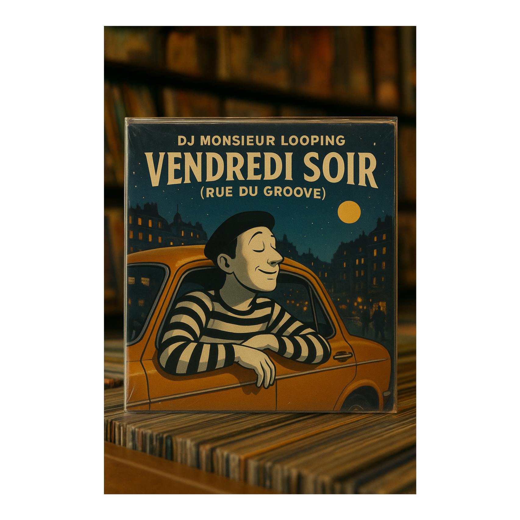 130bpm, danceable French nu-jazz hip-hop house track blending dusty MPC grooves with Parisian street ambiance and syncopated beats, Funky upright bass drives the beat under crisp jazz drums, wah guitar licks, muted trumpet stabs, and warm Rhodes chords, and street chatter set the scene — a Friday night in Paris, The core sample, “On sort ce soir, ” sounds like a 60s French chanson repeats like a hypnotic mantra, chopped, scratched, and looped with turntable flair, Layers of congas, brushed snares, and subtle accordion, The arrangement builds gradually with trumpet solos, sample echoes, and rhythmic scratches before fading back into the night, Playful, cinematic, and irresistibly groovy with D&B vibes, nujazz, electro house, jazz house, nu-funk, future house with hiphop scratches, gritty dirty electro beats mix with jazz drums and mpc sampling, power full heavy electronic sampled scratched beats