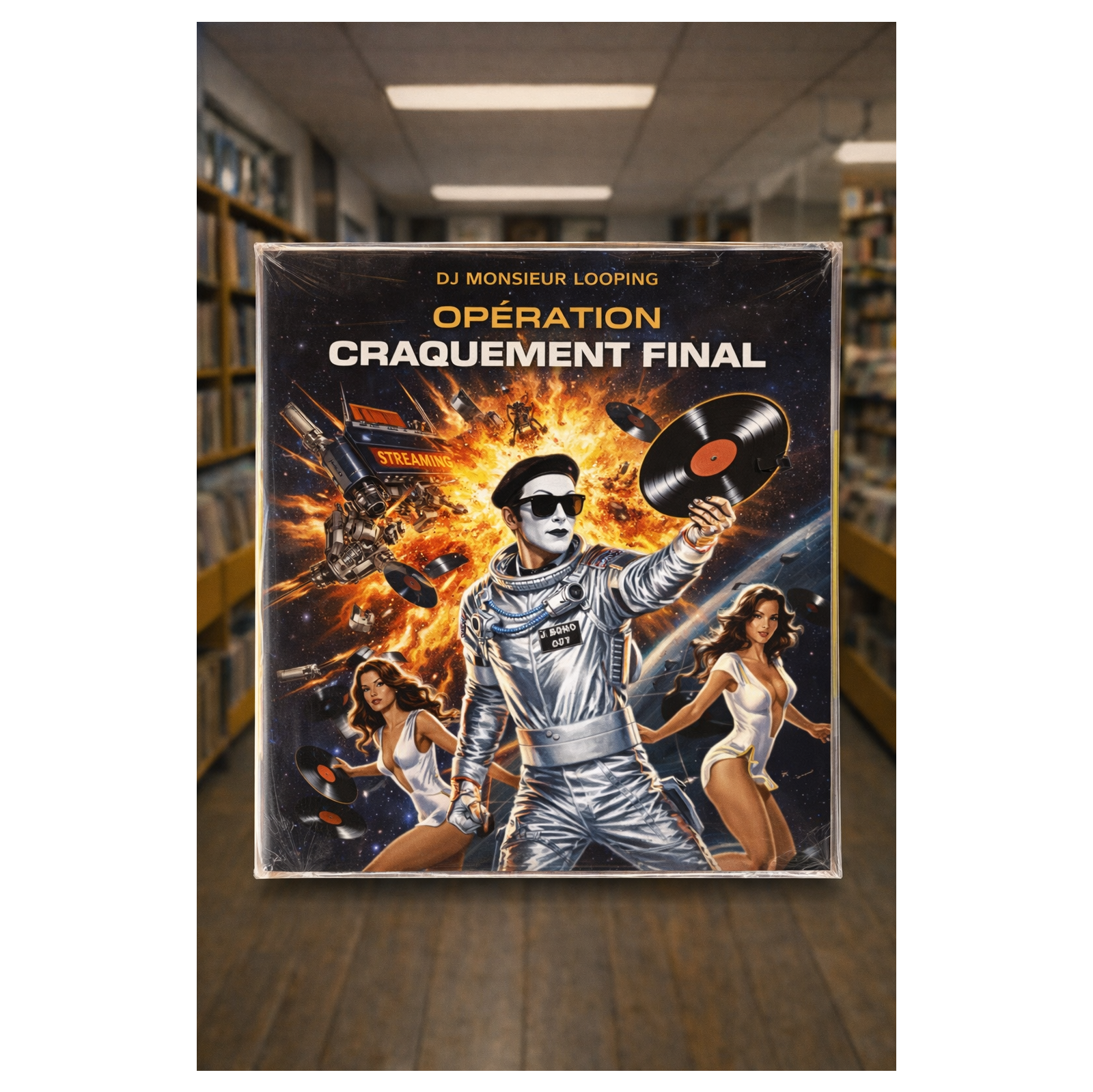 full orchestra space funk heavy breakbeat D&B French cinematic instrumental abstract french-ghetto-paris-hip-hop track with a deep electro beat, MPC style sampled sound-collage, spy-jazz in space cinematic strings, silly fun absurdity, explosive orchestral spy space soundtrack, zero gravity DJ battle, heavy vinyl scratching as weapons, pew pew laser synthesizer sound design made from turntable scratches and synths, 60s style big band dark brass stabs, dark long dramatic trombones, space choir hits, dark theremin melodies, Moog-organ analog knob turning space synths, upright bass groove, dusty boom bap drums, French presidential radio samples, cinematic strings, vinyl crackle as core texture, sci-fi funk energy, playful yet epic tone, over-the-top spy parody, analog vs digital theme, groove destroying a spaceship, stylish absurd heroism, tuxedo funk in orbit, dramatic builds, explosive drops, humorous dialogue, retro-future spy jazz hip hop fusion, dark cinematic with French flair, ‑pop, ‑funk, ‑rock, ‑metal, ‑boring