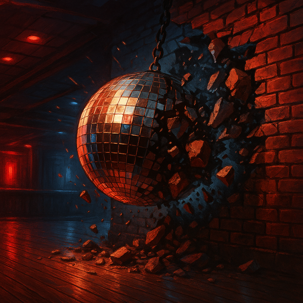 Post-punk/disco-punk fusion with a gritty, raw late-70s NYC club feel, Driving, melodic bassline and tight hi-hat disco beats, and jagged rhythm guitar stabs drenched in chorus, Layer in analog synth arpeggios and shimmering pads to give it a futuristic, dystopian edge, Vocals are half-sung, half-spoken with a detached yet emotional tone, with occasional robotic harmonies for a time-traveler vibe, Include moments of stripped-down bass and percussion before explosive, full-band choruses, Mood: sweaty, dangerous, and hypnotic โ like a chrome visitor from the year 20, 000 losing themselves under a spinning mirrorball in 1978 New York