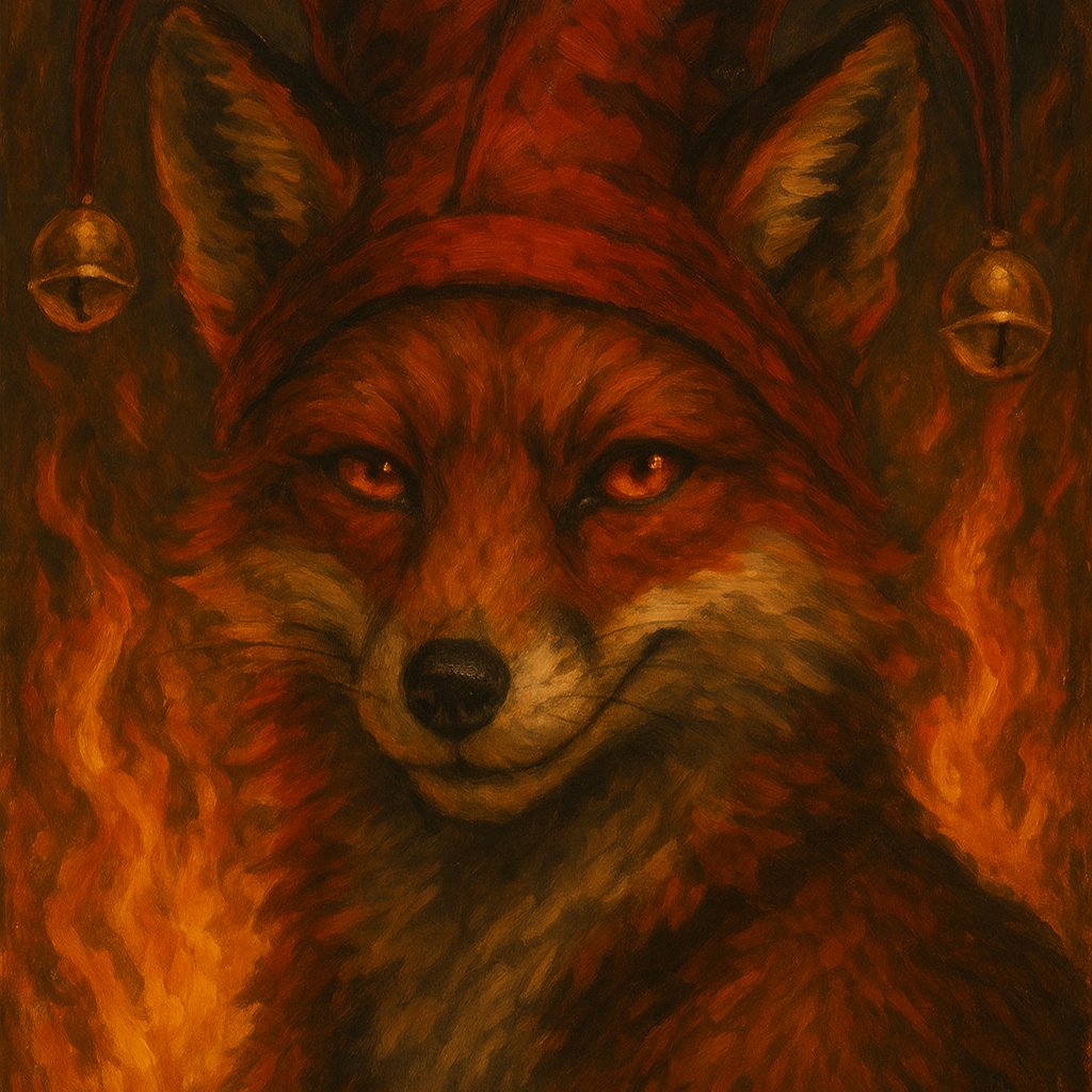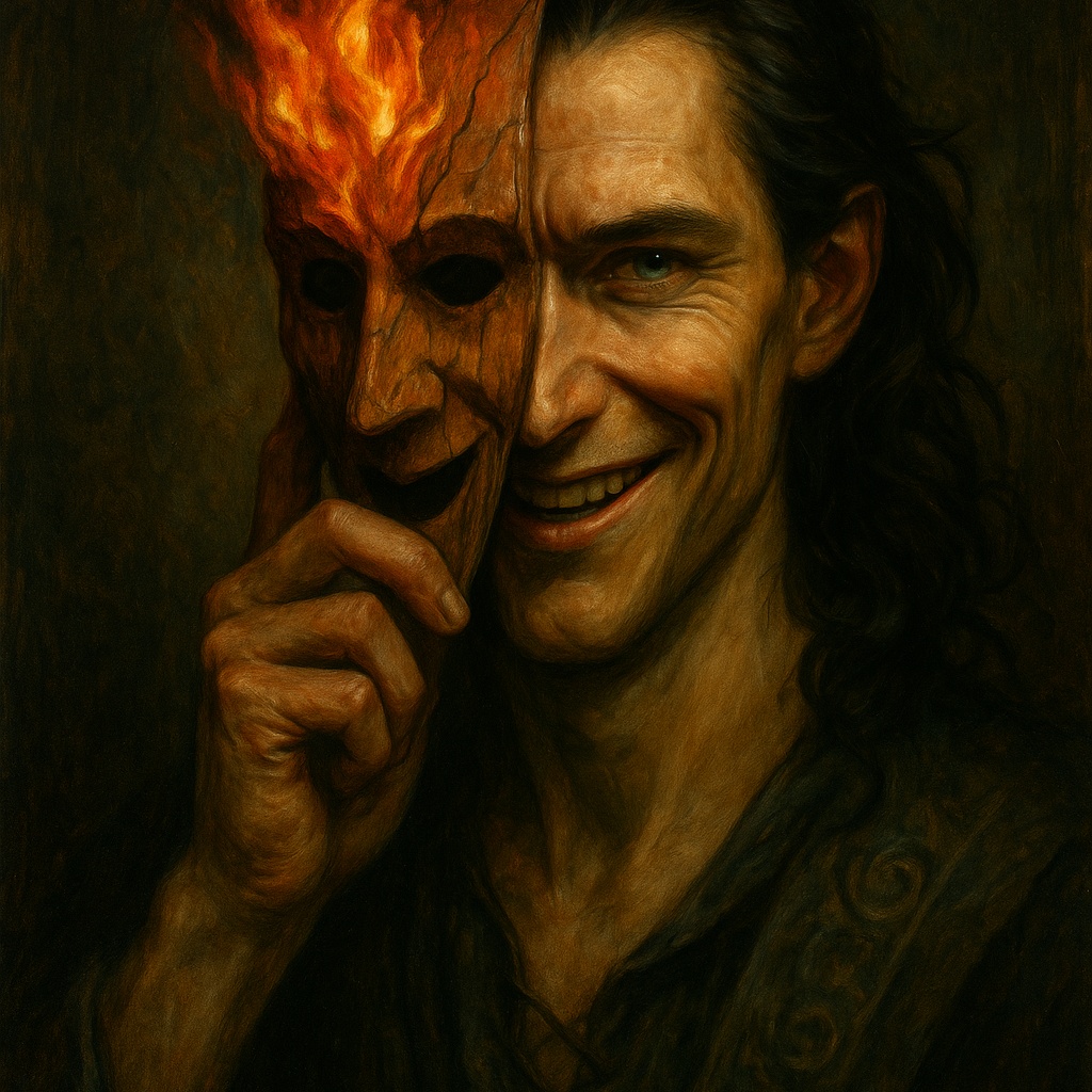 cheeky, theatrical pagan metal track with gothic folk elements, The sound blends heavy tribal drums, distorted guitars, and eerie nyckelharpa or tagelharpa passages, Vocals are charismatic and cunning — switching between melodic lines and biting, ironic delivery, The song weaves between powerful metal riffs and mischievous folk rhythms, channeling the spirit of Loki, the trickster god