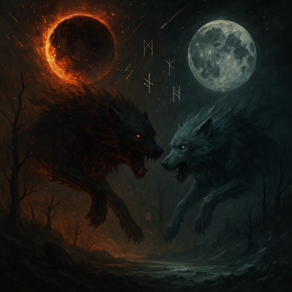 Gothic, Viking metal, growls + black metal chorus, Norse myth, Sköll & Hati, sun and moon devoured, Ragnarök, Old Norse chants, dark epic mood, thunder drums, ritual, apocalyptic, duet female