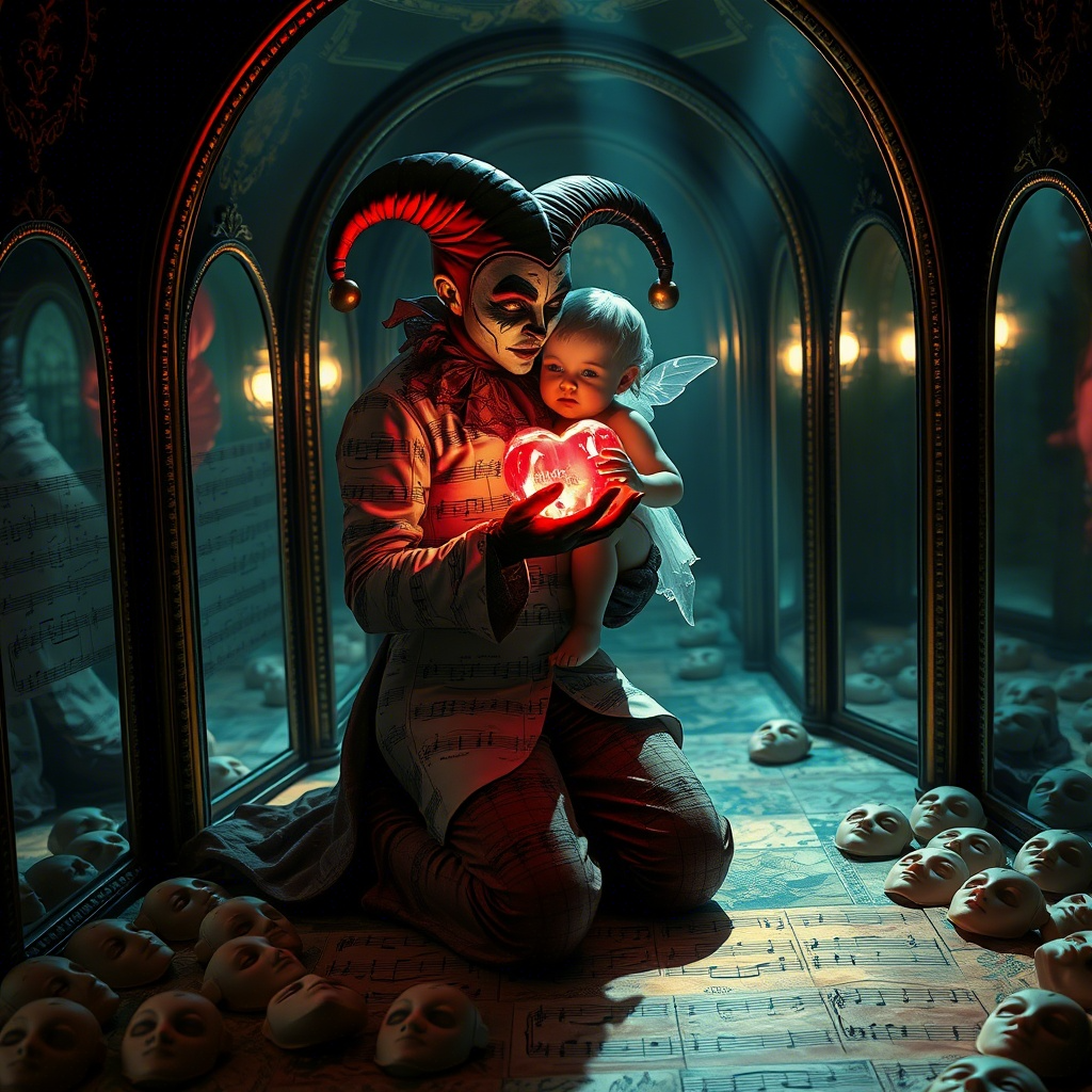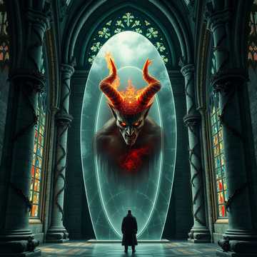 At 78 bpm, the song opens with eerie prepared piano clusters and sparse frame drum hits, joined by haunting nyckelharpa melodies evoking Slavic ritual, Timpani rumble subtly beneath, setting a dark ceremonial pulse, Tuvan throat singing weaves through each section, deepening the mirror dimension atmosphere, The Male Baritone narrates, with the Hero and Friend Hero voices interlocking in harmonic, folk-inspired chants; the Demon Voice cuts in, enveloped in layered low drones and spectral effects, intensifying the ominous neoclassical darkwave texture