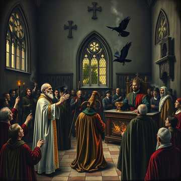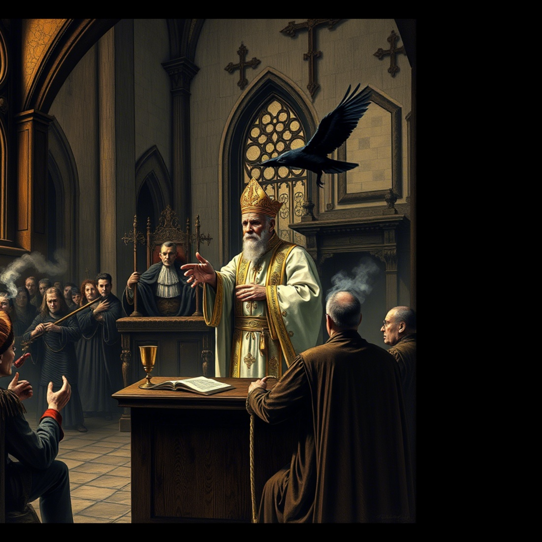 A Baroque folk opera opens with acoustic guitar arpeggios under a haunting church organ, cello outlining tense harmonies, Timpani accentuates key moments, Male baritone narrates, while the raven's deep velvet baritone enters with reverbed vocals and suspenseful violin tremolo, Sudden silences heighten suspense before the dramatic verdict