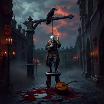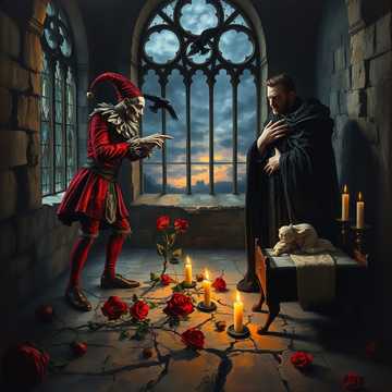 A dark folk meets neoclassical ballad at 80 bpm, opening with intricate fingerpicked acoustic guitar, deep cello undercurrents, and layered hammered dulcimer for a medieval gloom, Solo violin weaves mournful leads, Vocals alternate: narrator (male baritone), prince (deep baritone), and jester (raspy baritone), each with slight reverb and distant echoes on dialogue lines, The cimbalom lends faint distorted textures, Whispering effects and echoing winds surface in the bridge, heightening the gothic drama