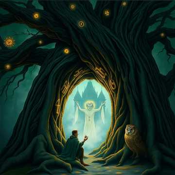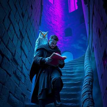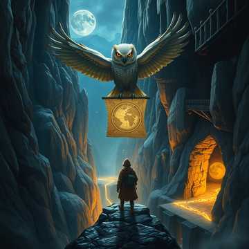 Opening with a sparse acoustic guitar and distant cello, layered by deep synth bass and pulsing synth drums, the atmosphere conjures a digital storm within ancient stone, Ethereal pads hover as violin weaves through distorted glitches, Vocal interplay—baritone narrator, spectral soprano owl, and resolute hero—rides the shifting texture, driving the epic, uncanny mood as reality warps, neon flickers, and electric wind breathes in the background