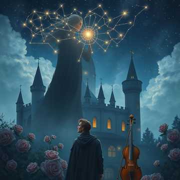 [style: Neo-Classical Folk] [mood: Celestial Romance] [instrument: Harp, Cello, Violin, Celesta, Acoustic Guitar] [bpm: 72] [vocal: Warm Baritone with Gentle Grit] [atmosphere: Starlit Castle Courtyard] [key: A Major] [feature: Cello-Violin Dialogue] [emotion: Wondrous Discovery] [special: Constellation Harmonies]