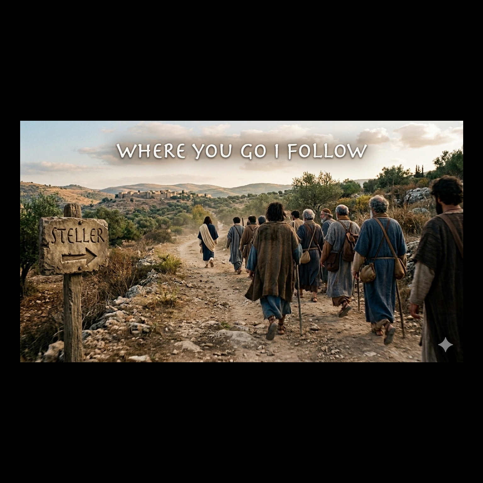 Christian rock song at 92 BPM with uplifting electric guitars, strong drums, and anthemic energy, Starts gentle and builds into a powerful chorus with a long instrumental pause after the first line “Where You go” before returning with “I follow, ” Emotional yet driving, modern worship rock sound