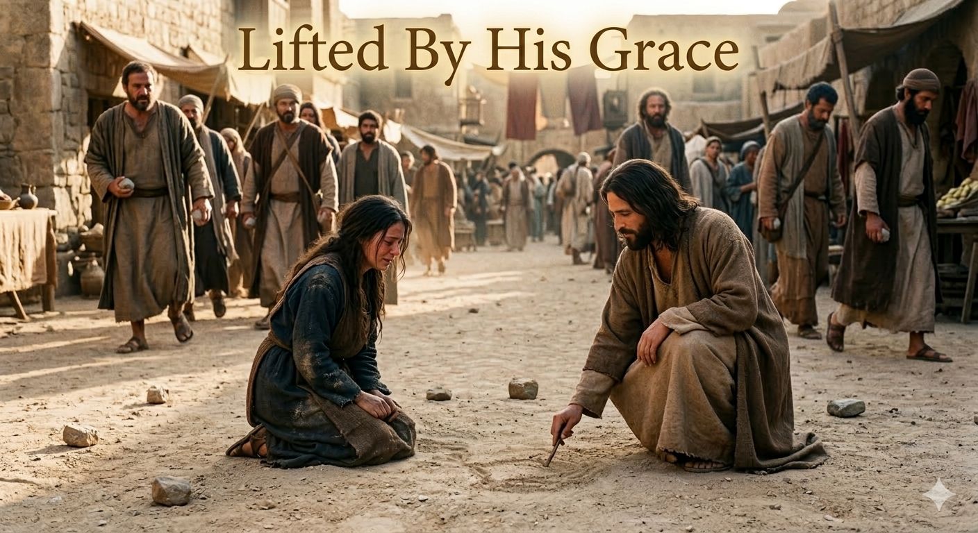 Create an intimate, acoustic Christian storytelling song in the style of reflective indie rock, similar in mood to “I’ll Follow You Into the Dark, ” Use gentle fingerpicked acoustic guitar as the main instrument, with subtle soft harmonies or piano accents for emotional depth, The vocal should be warm, narrative, and introspective, emphasizing pauses and phrasing so the story unfolds naturally, Keep dynamics soft in the verses, build slightly in the chorus, and include a cinematic “stones dropping” moment after the first chorus, Follow this structure and lyrics exactly, using the bracketed notes for performance cues, Make the tempo medium, reflective, and flowing, Include gentle dynamic shifts for emotional effect, with introspective vocals and intimate acoustic instrumentation